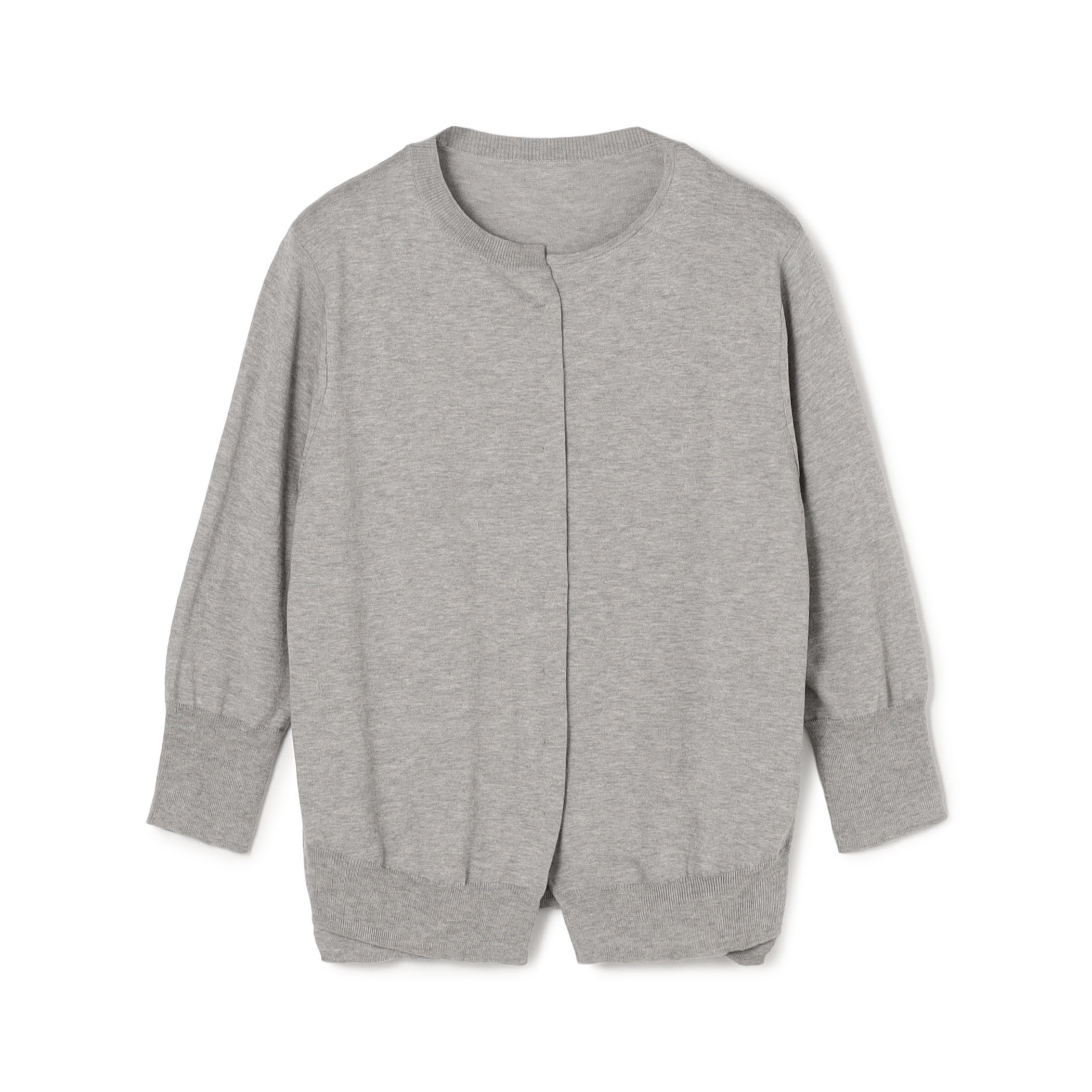 カーディガンは7部袖でシアーな長袖をレイヤードしても着用でき、ボタンを裏表に見せることデザインのあるカーディガンにもなります。