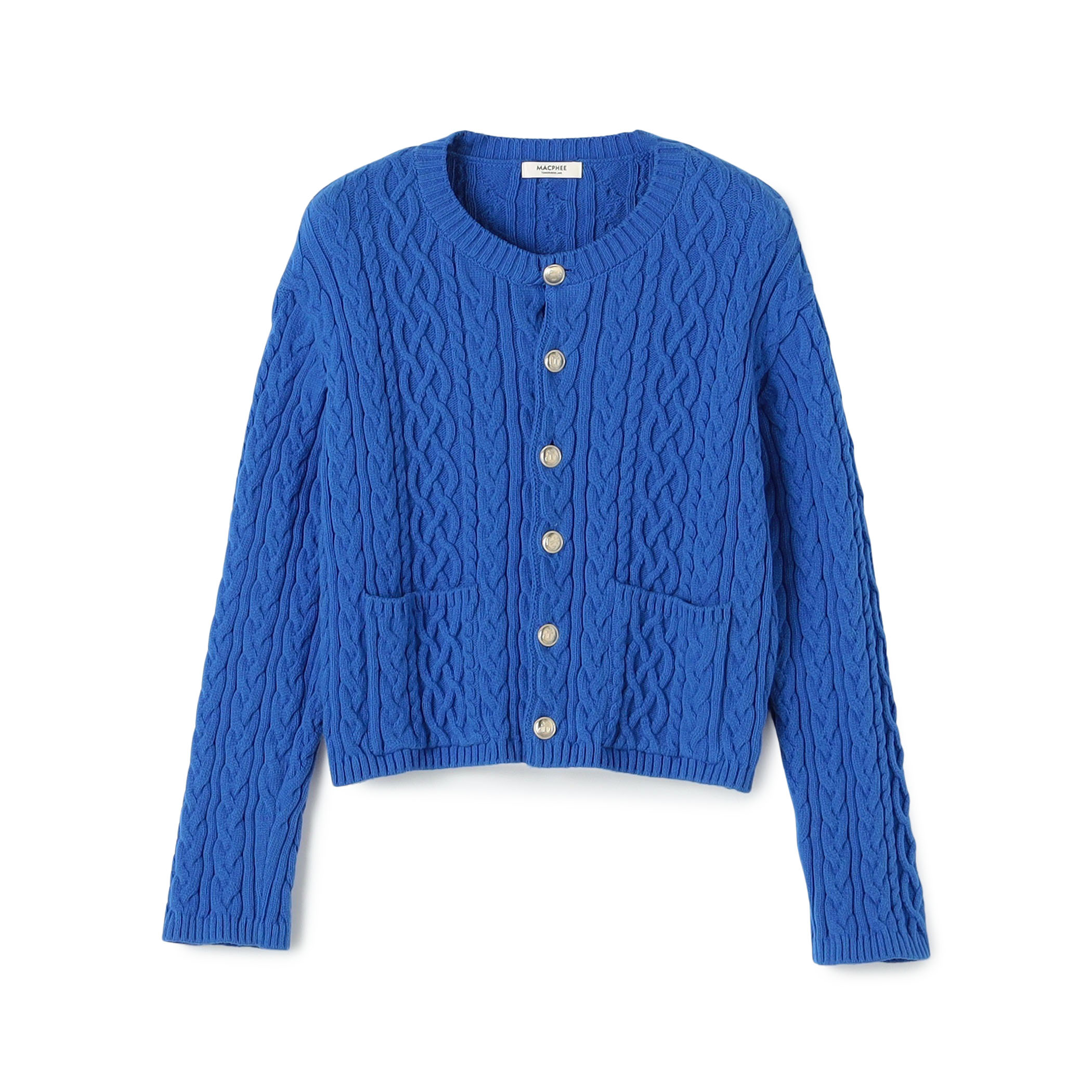 トラディショナルなアイテムであるケーブルカーディガンも、やや短めの着丈とディープなトーンのブルーのカラーが新鮮な印象です。アームや身頃がタイトすぎないデザインで、自然素材を使用したニットならではのやわらかな着用感です。