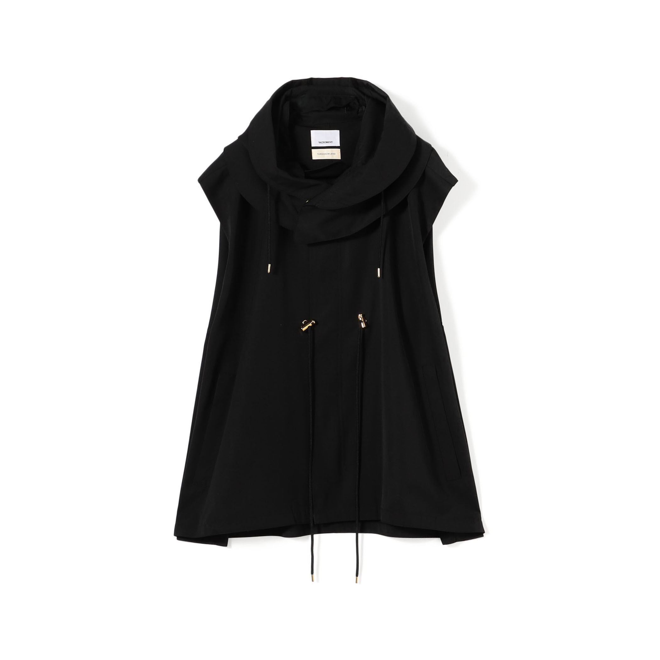 ハリのある素材で首元のボリューム感が楽しいジレは、襟の取外しやウエスト絞りなど着こなしのバリエーションが広い一枚。