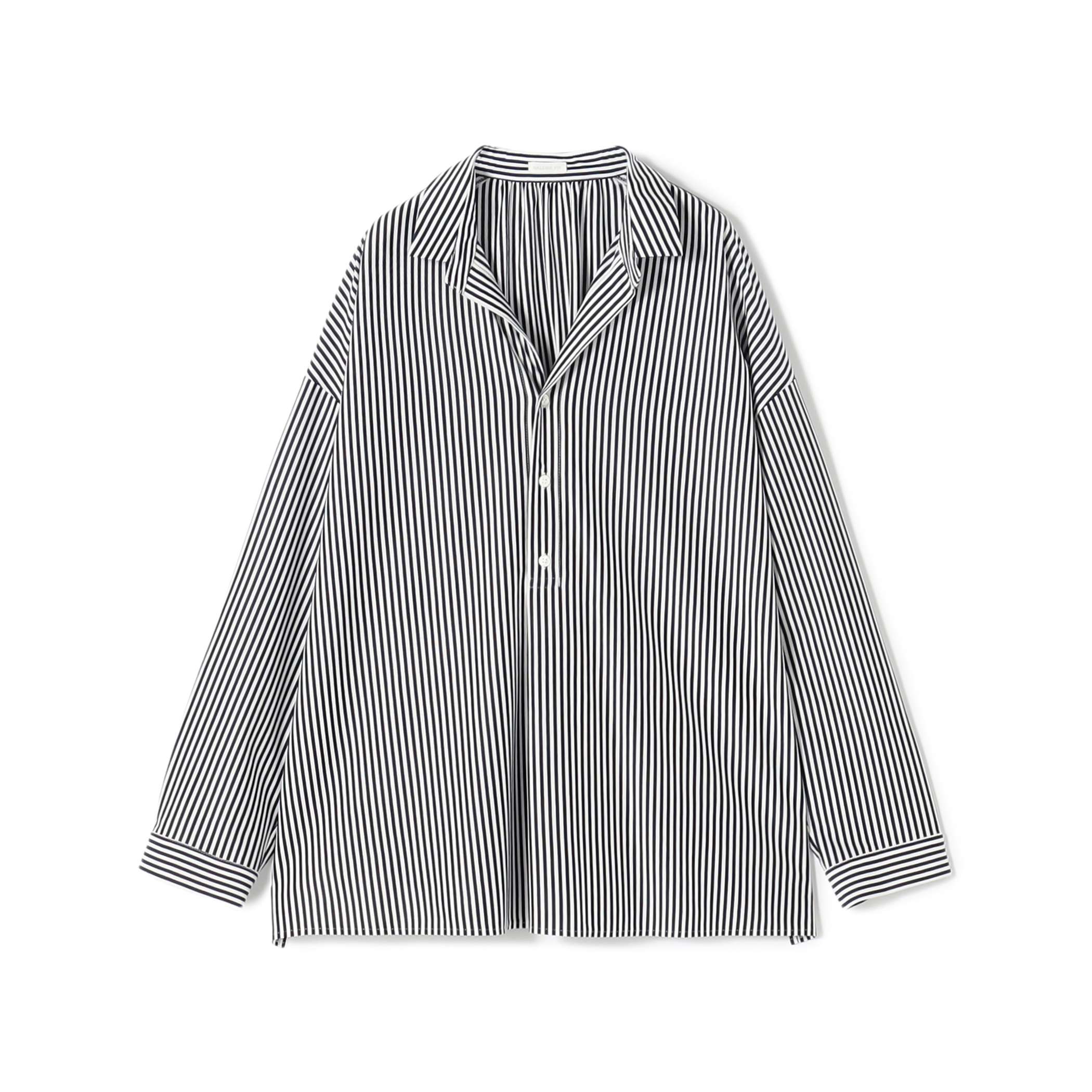 ストライプのカットソーシャツのインナーに、フリルのシャツをレイヤードしたスタイリング。光沢ととろみがあるカットソーシャツはシワになりにくく、手洗いも可能な扱いやすい素材です。小物はシルバー系でまとめクリーンな印象に。