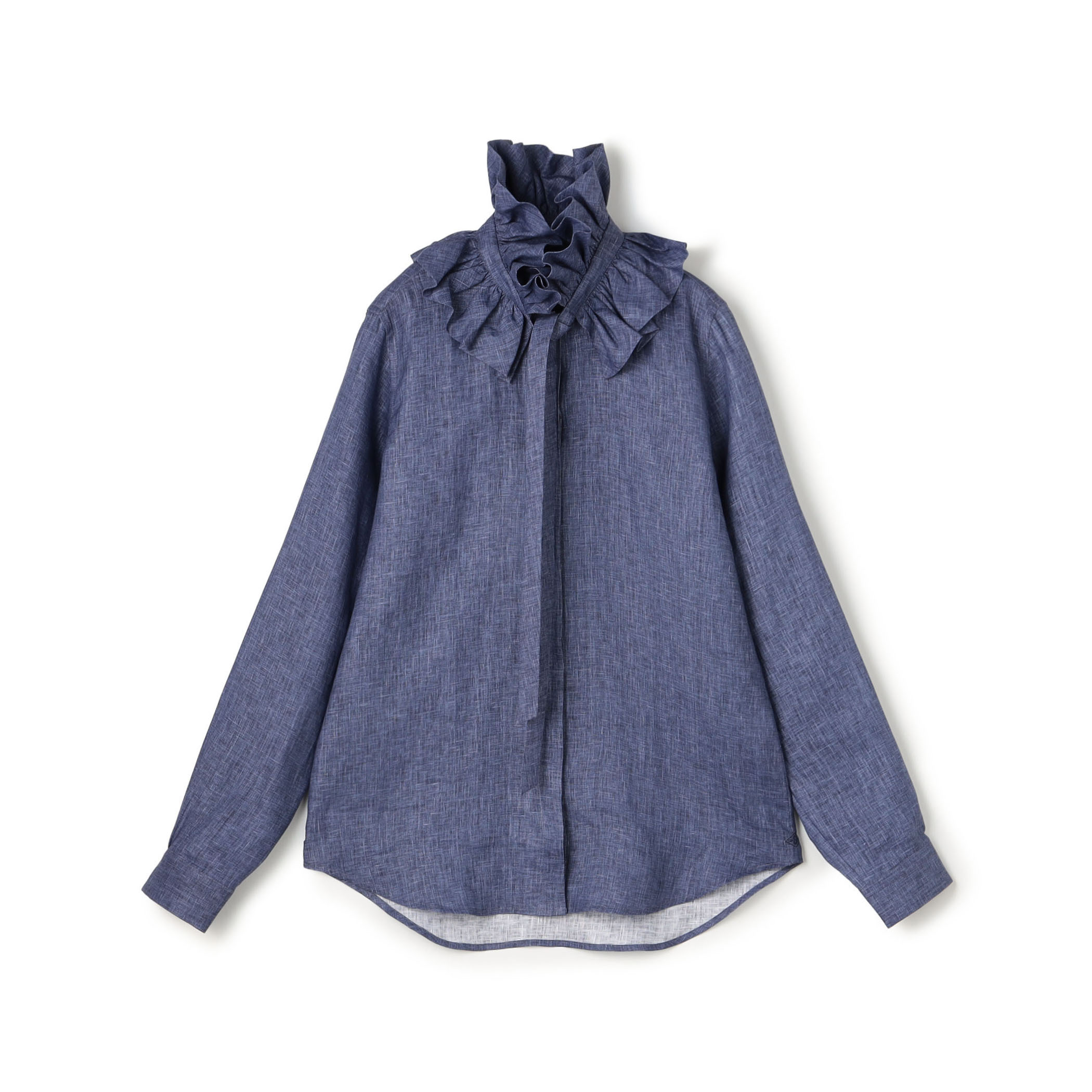 フェイクレザーのオールインワンにフリルカラーのシャツを合わせ、モード感のある大人カジュアルスタイルに。