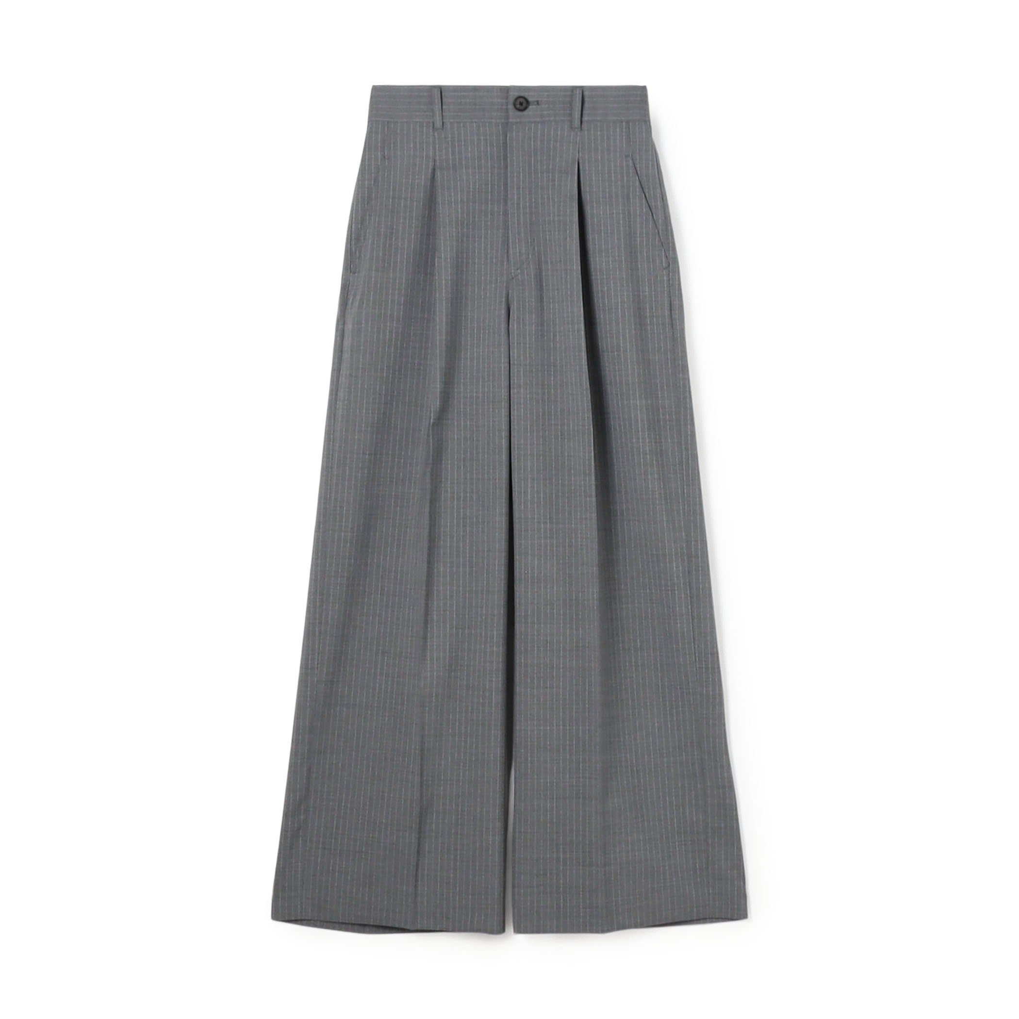 柔らかいカラーのピンクなので、グレーストライプのシャープな印象のボトムスと合わせて、フェミニンになりすぎないようにスタイリングしました。