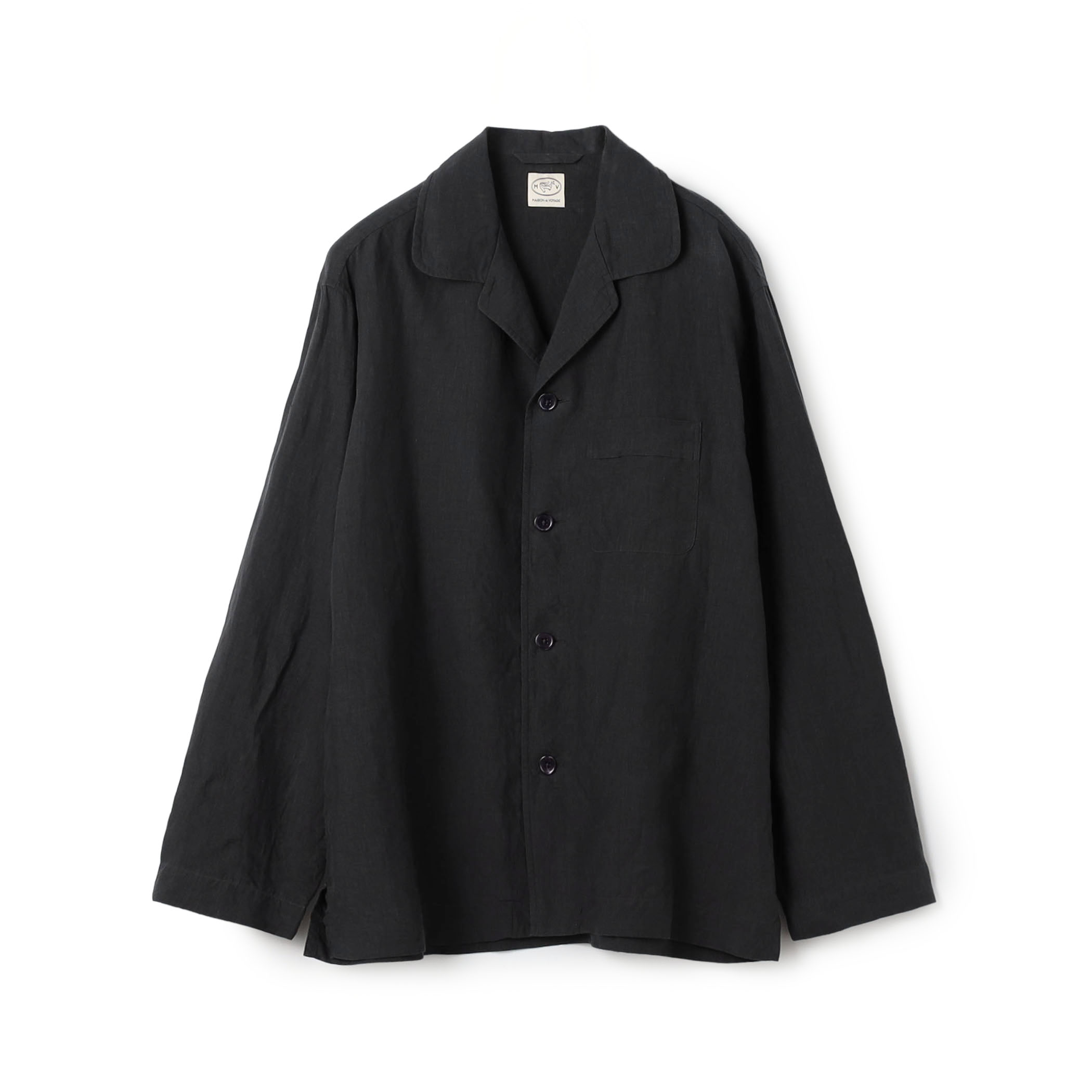 チャコールグレーのリネンシャツジャケットにグルカパンツをコーディネートしたスタイリングです。インナーにはコットンレーヨンペーパーヤーンのスキッパーニットを着用しています。