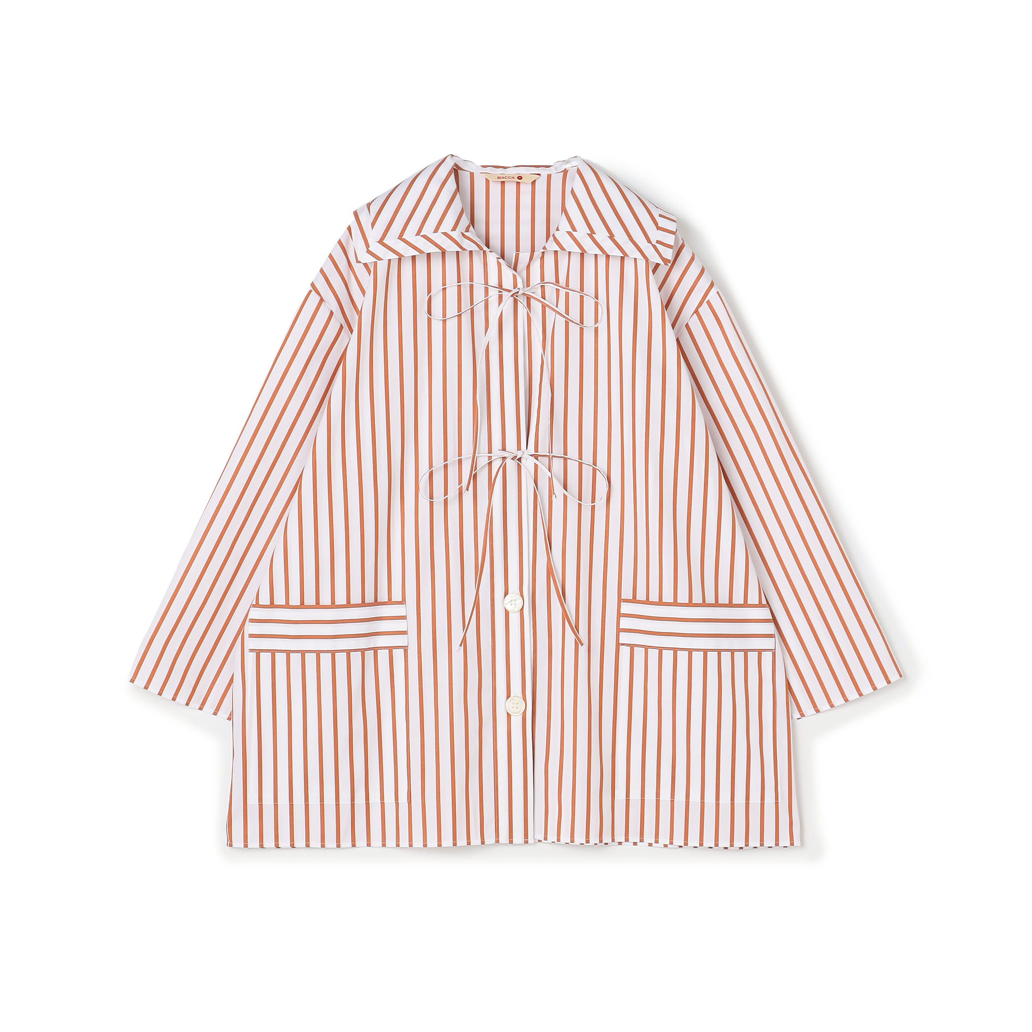 〈BACCA〉イタリアンストライプ シャツカーディガンは、大きめの襟とポケットがポイントで、前開きで羽織としても活躍する1着。