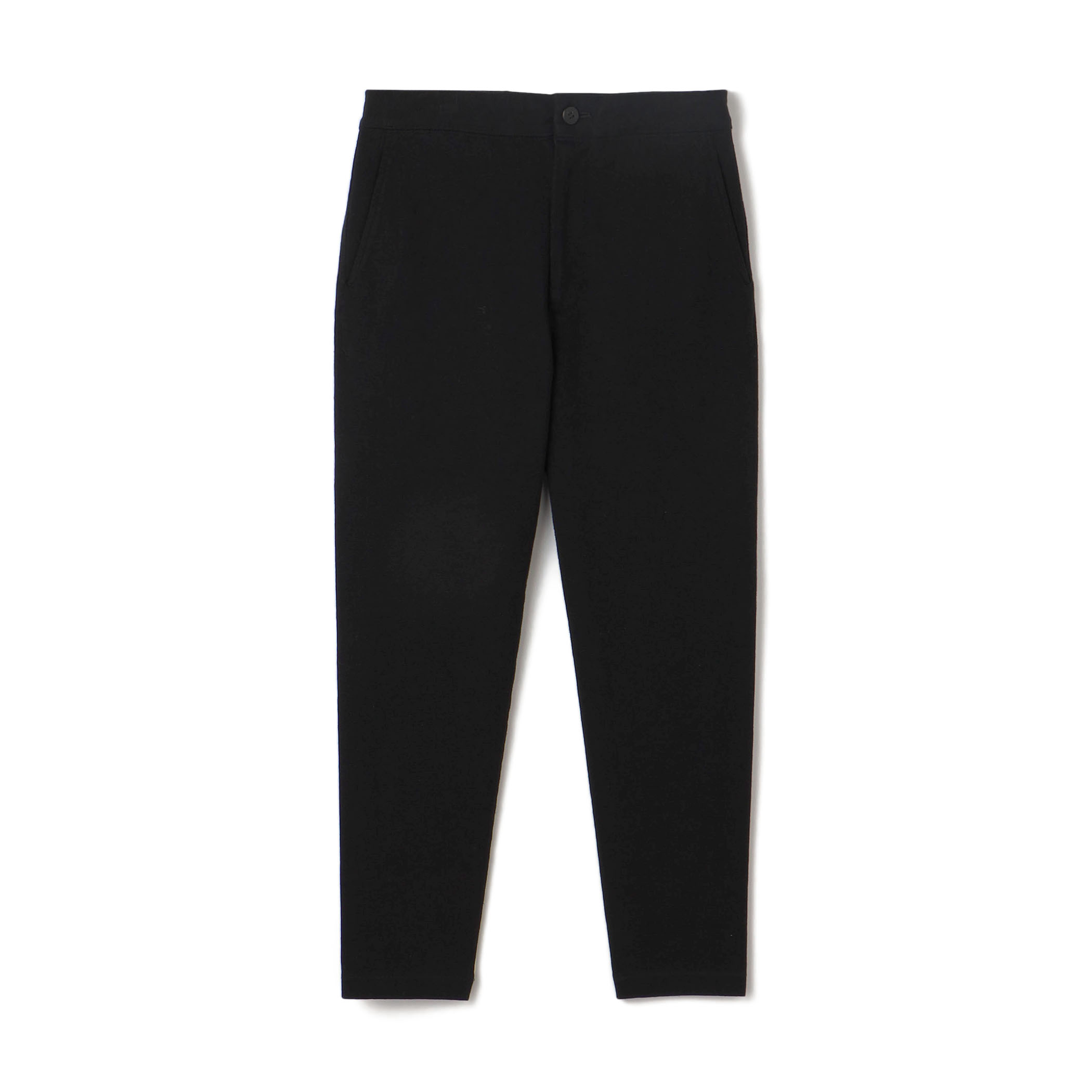 ノーカラージャケットにジャージの細身のパンツを合わせた、ジャケットスタイル。