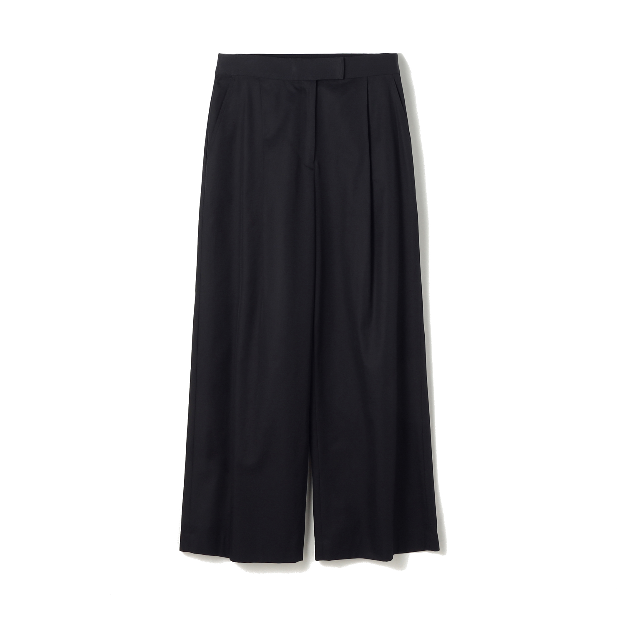 〈TOMORROWLAND collection〉のストライプボウタイブラウスに、タックの入ったシルエットが美しいネイビーパンツを合わせた大人なスタイリング。