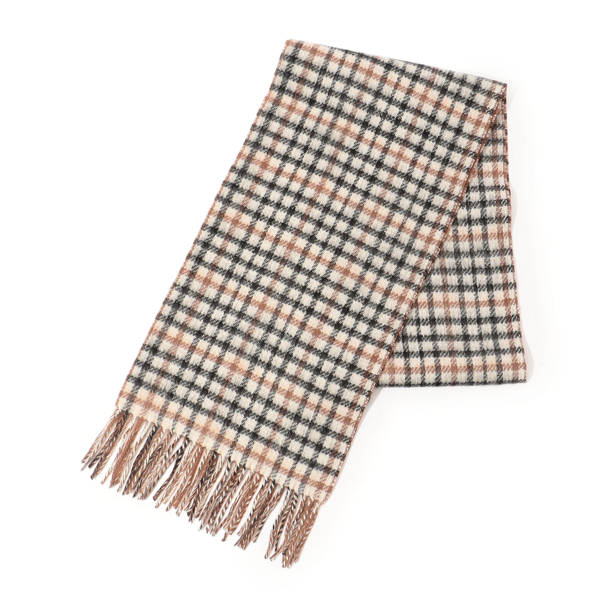 パンツ以外のアイテムが落ち着いた色の為、首元には全体に馴染むような色合いのチェックストールを用いました。