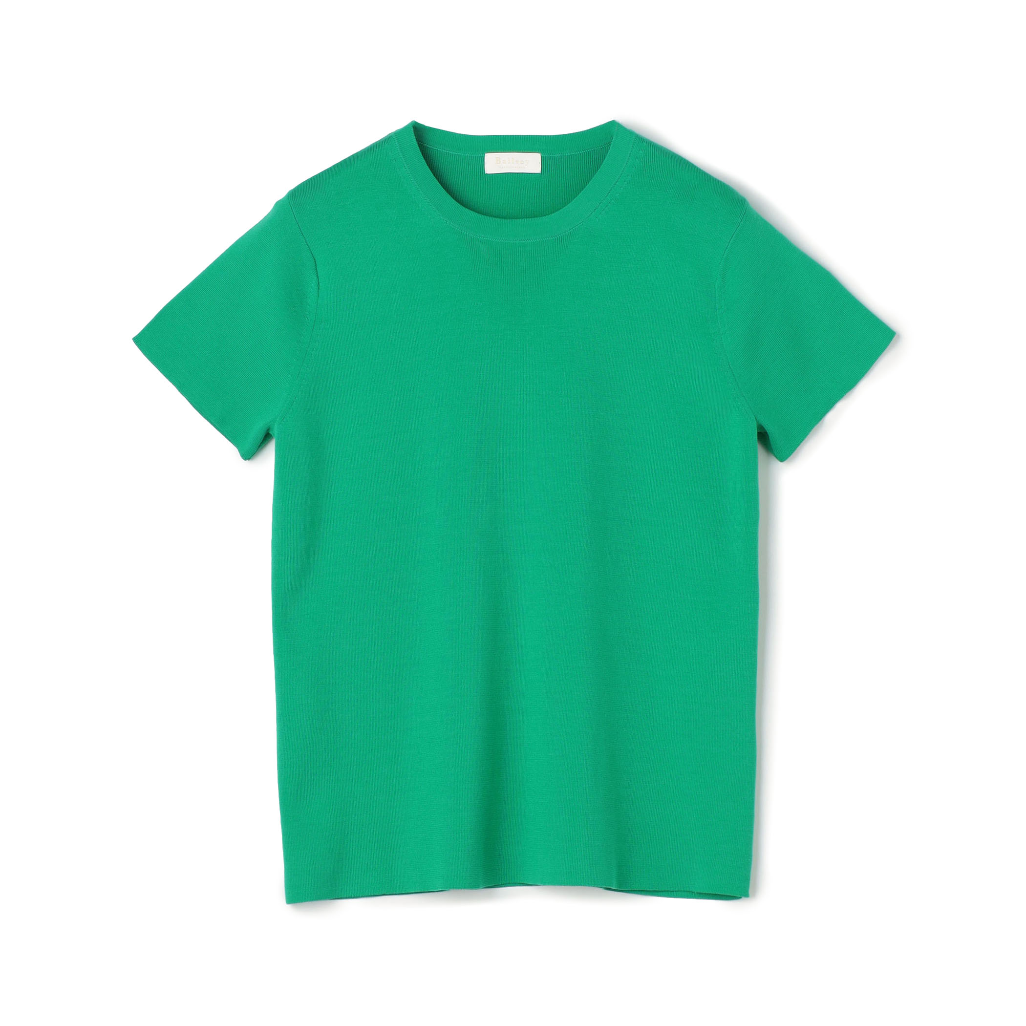 鮮やかなグリーンのニットとフラワープリントのスカーフが春を感じさせます。