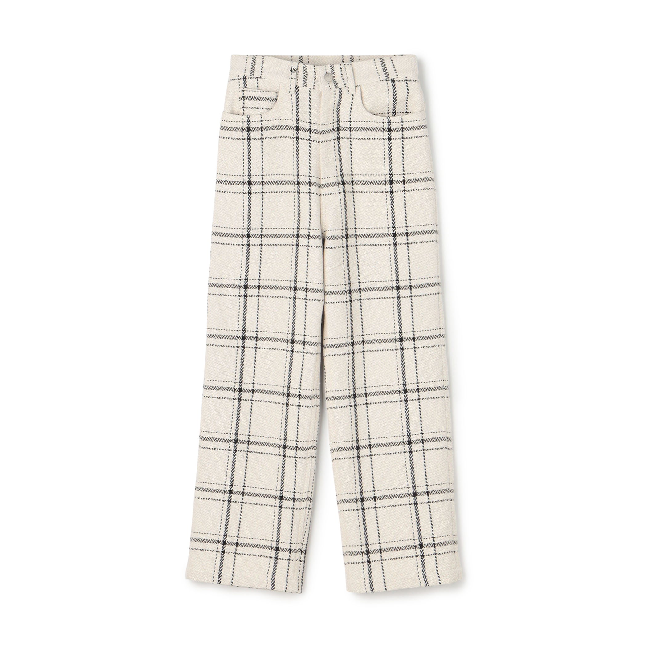 印象的なチェックのボトムスと合わせ、マニッシュな雰囲気でまとめてみました。