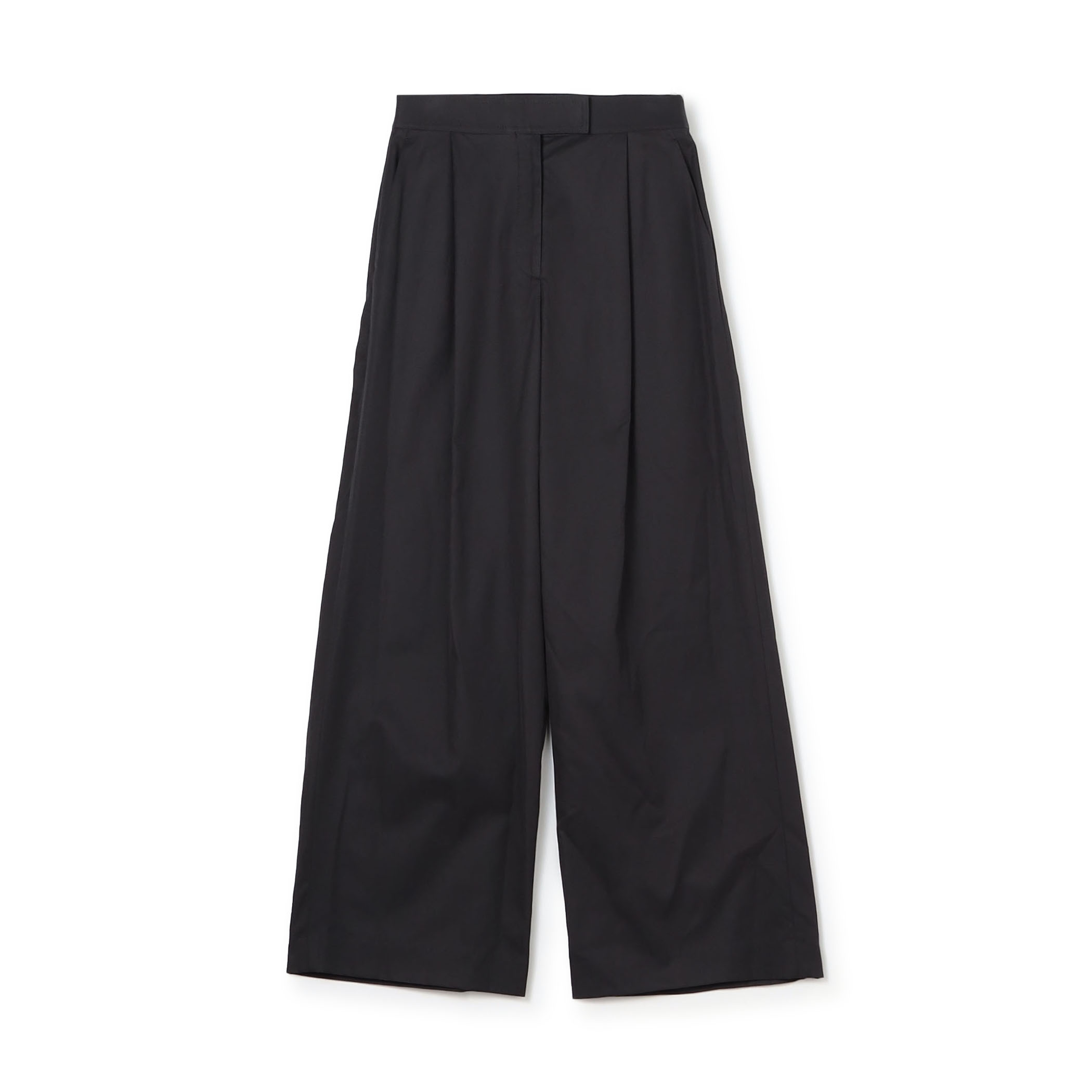 ネイビーのパンツと合わせ、華やかなブラウスが映えるスタイリングにしました。