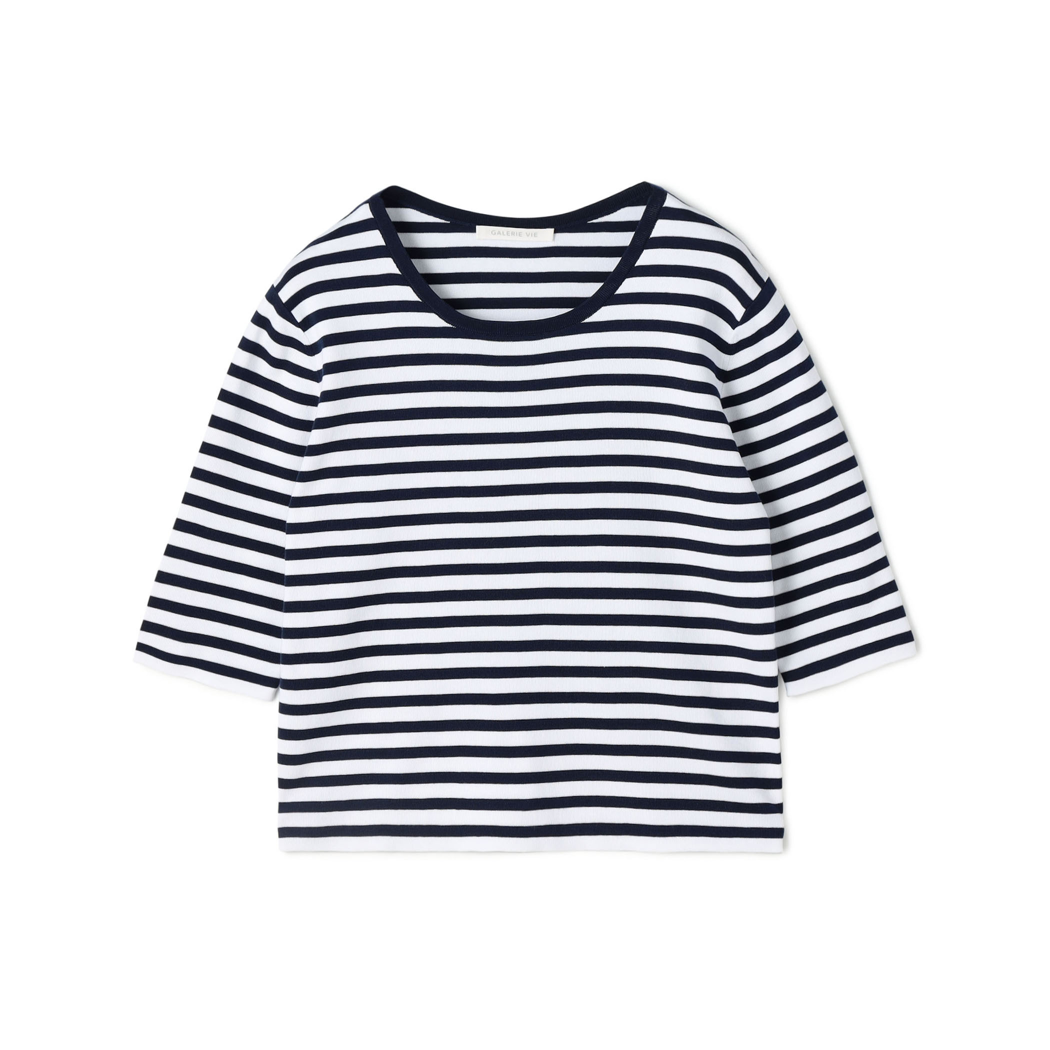 シーアイランドコットンのボーダーのニットとウーステッドウールのスカートを合わせて、少し秋を意識したスタイリングに。