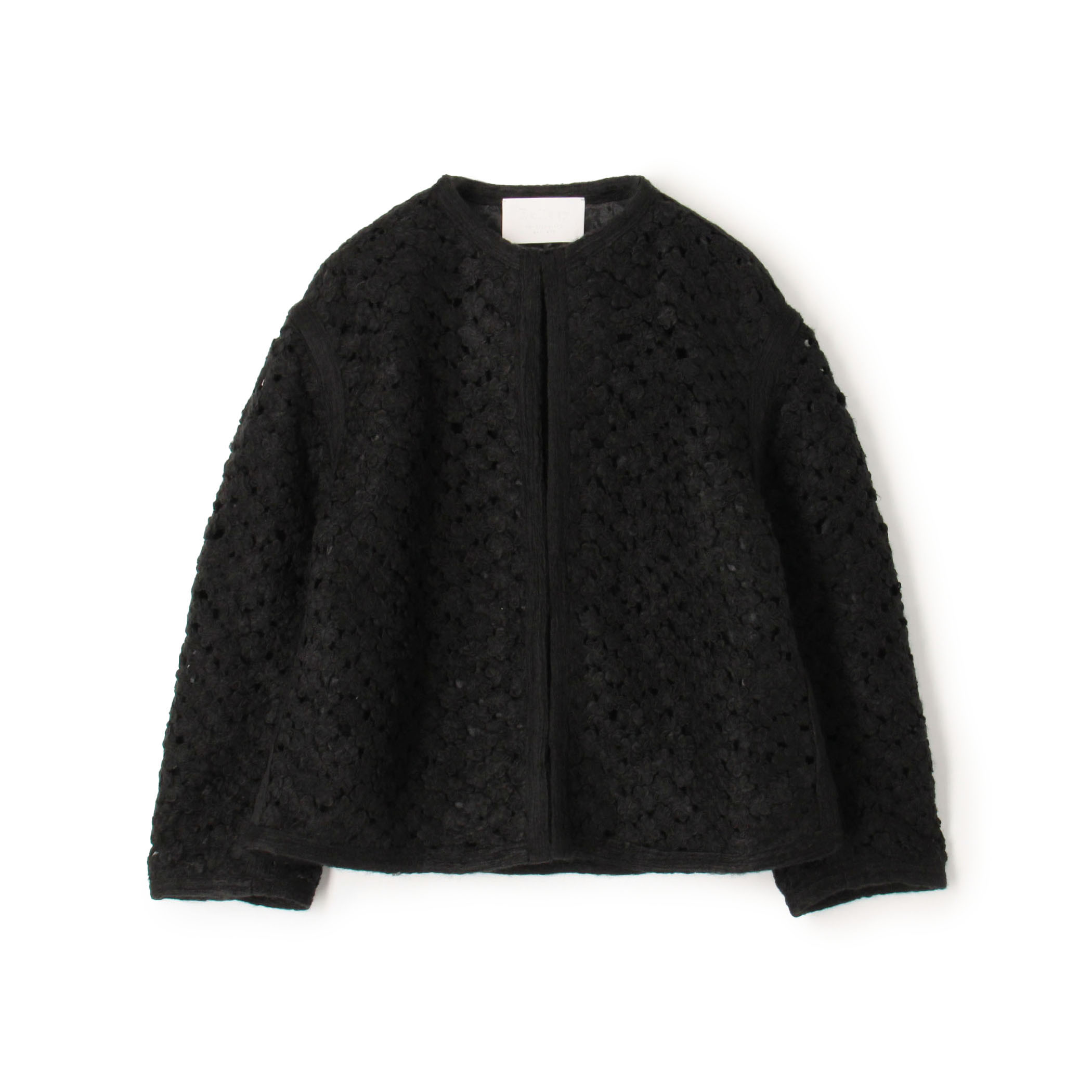 ジャケットは小さなお花の刺繍のように編み上げた生地でインナーとの透け感を楽しめるあるアイテム。