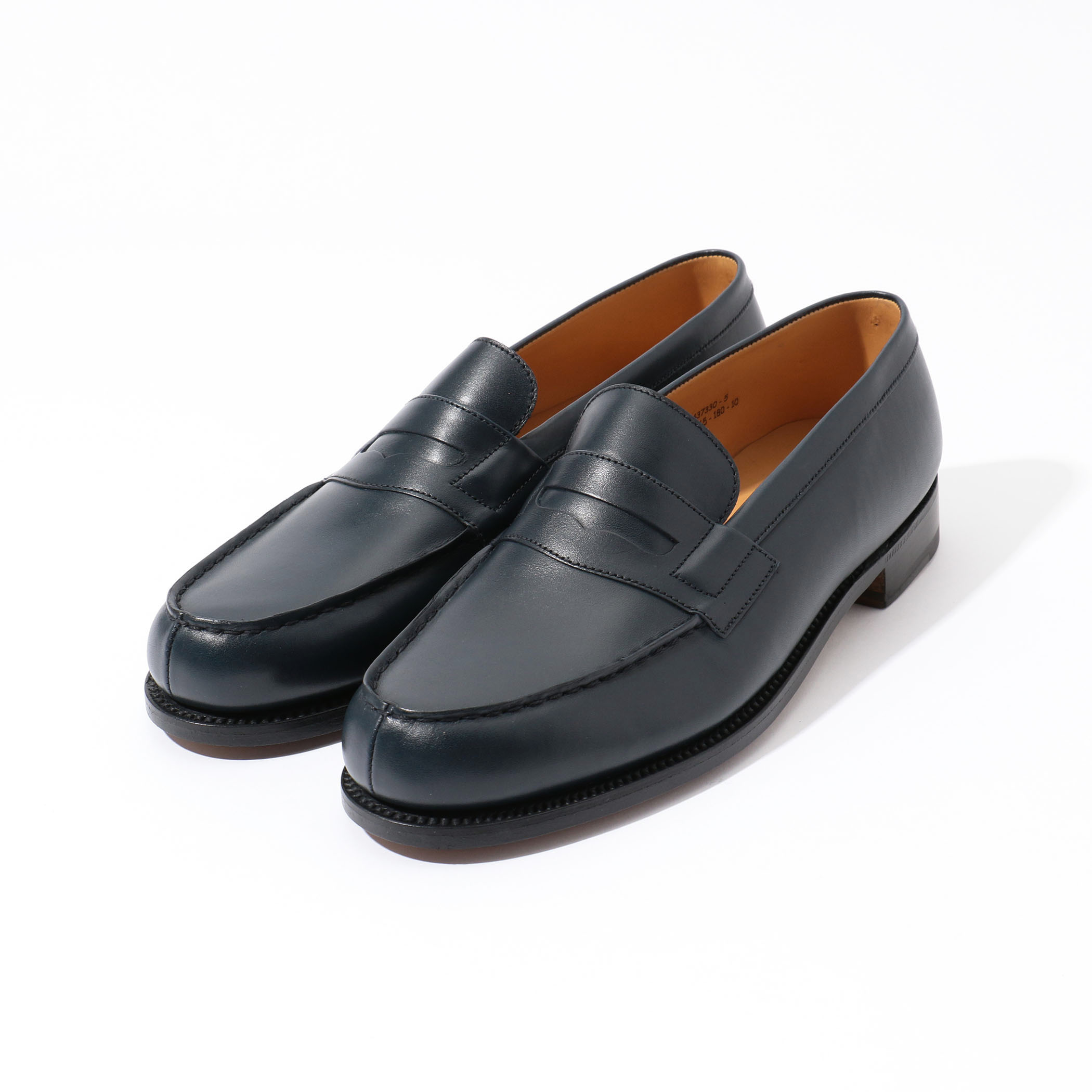 ネイビーのジャケットにタートルネックのニット。足元にローファーを合わせて王道のドレスダウン。