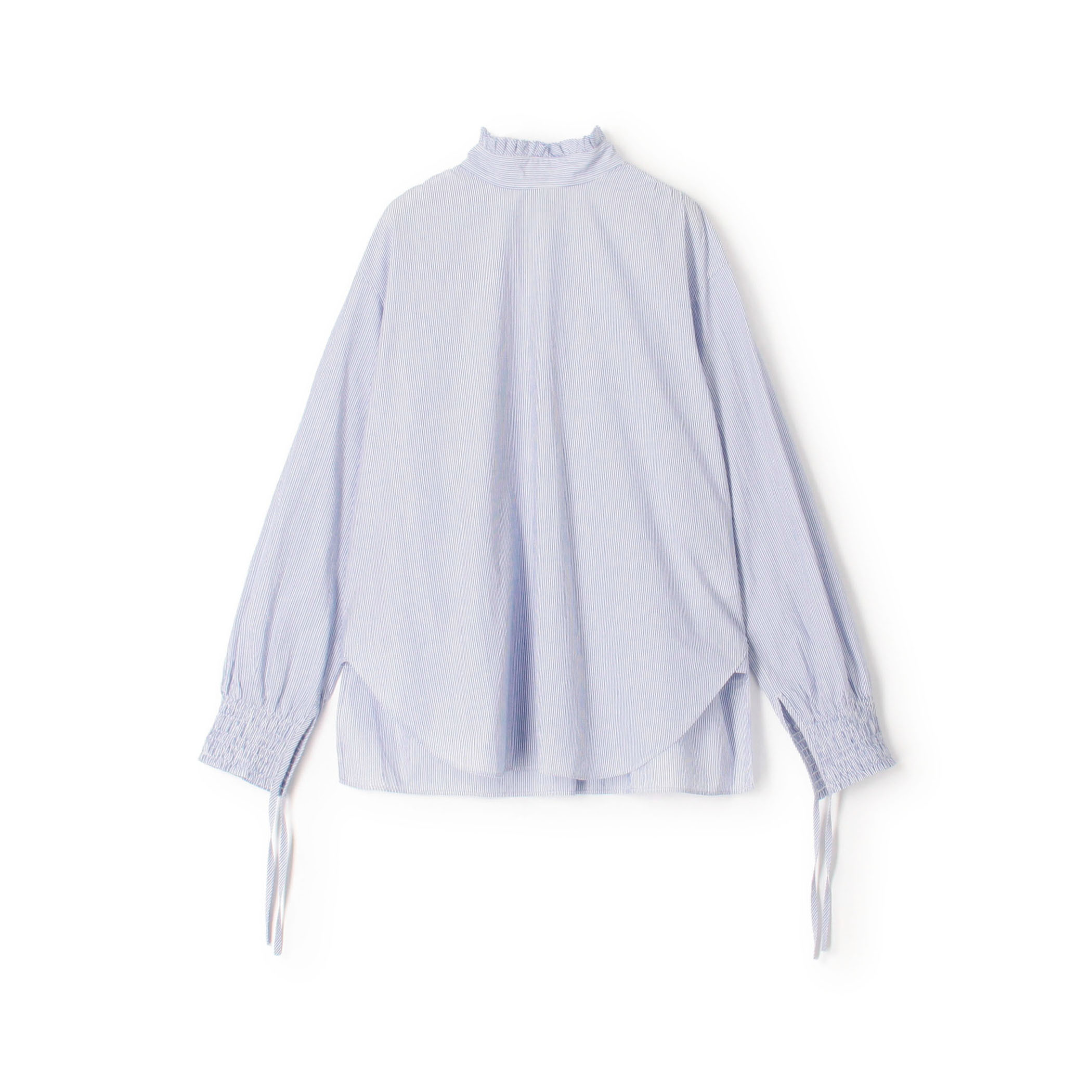 インナーにハイネックのブラウスを合せて全体をブルートーンでまとめました。袖にあしらった紐はそのまま長めに垂らした着こなしがおすすめです。