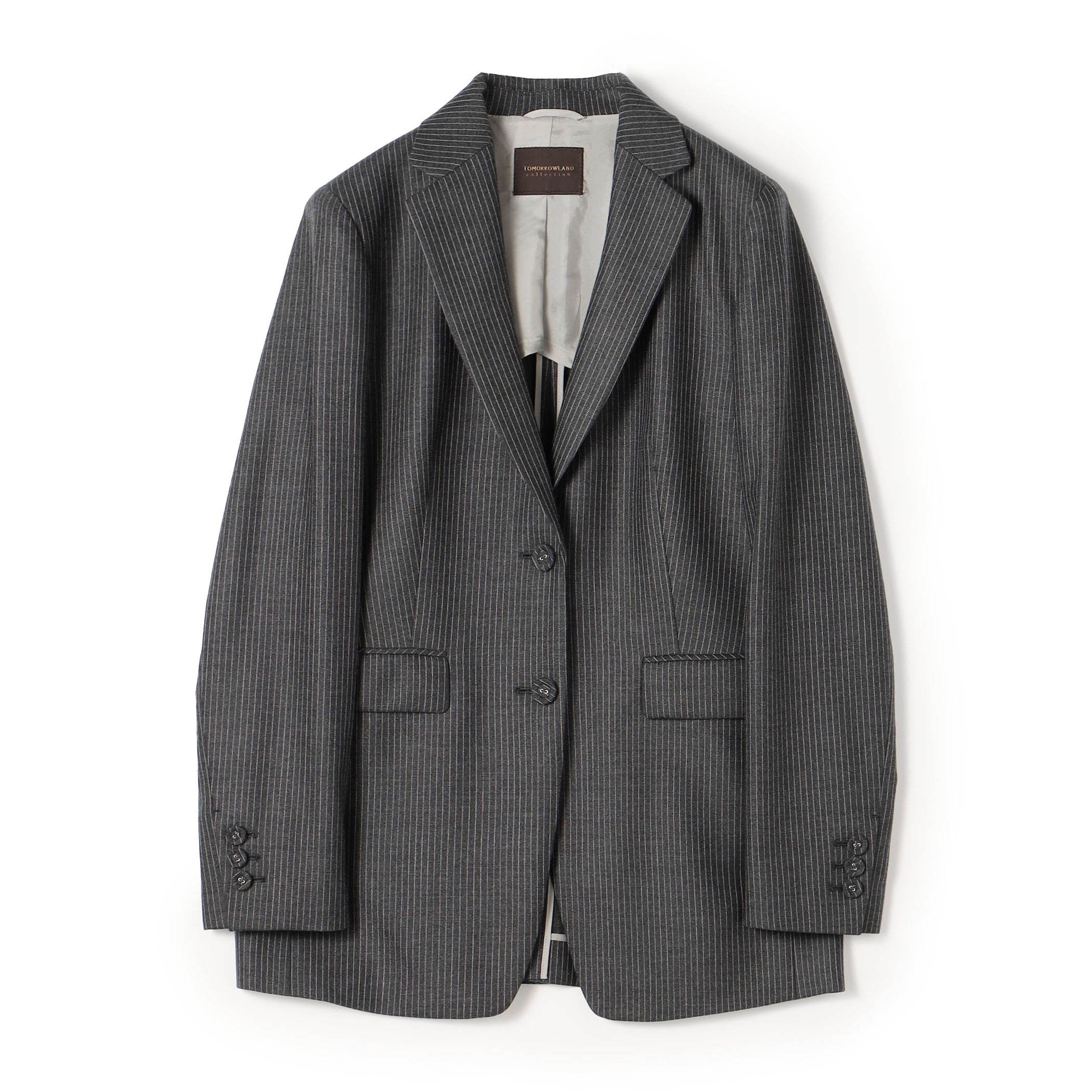 ジャケットは肩から袖山にかけて盛り上がりのないナチュラルショルダーで、すっきりとしたシルエットの一着。