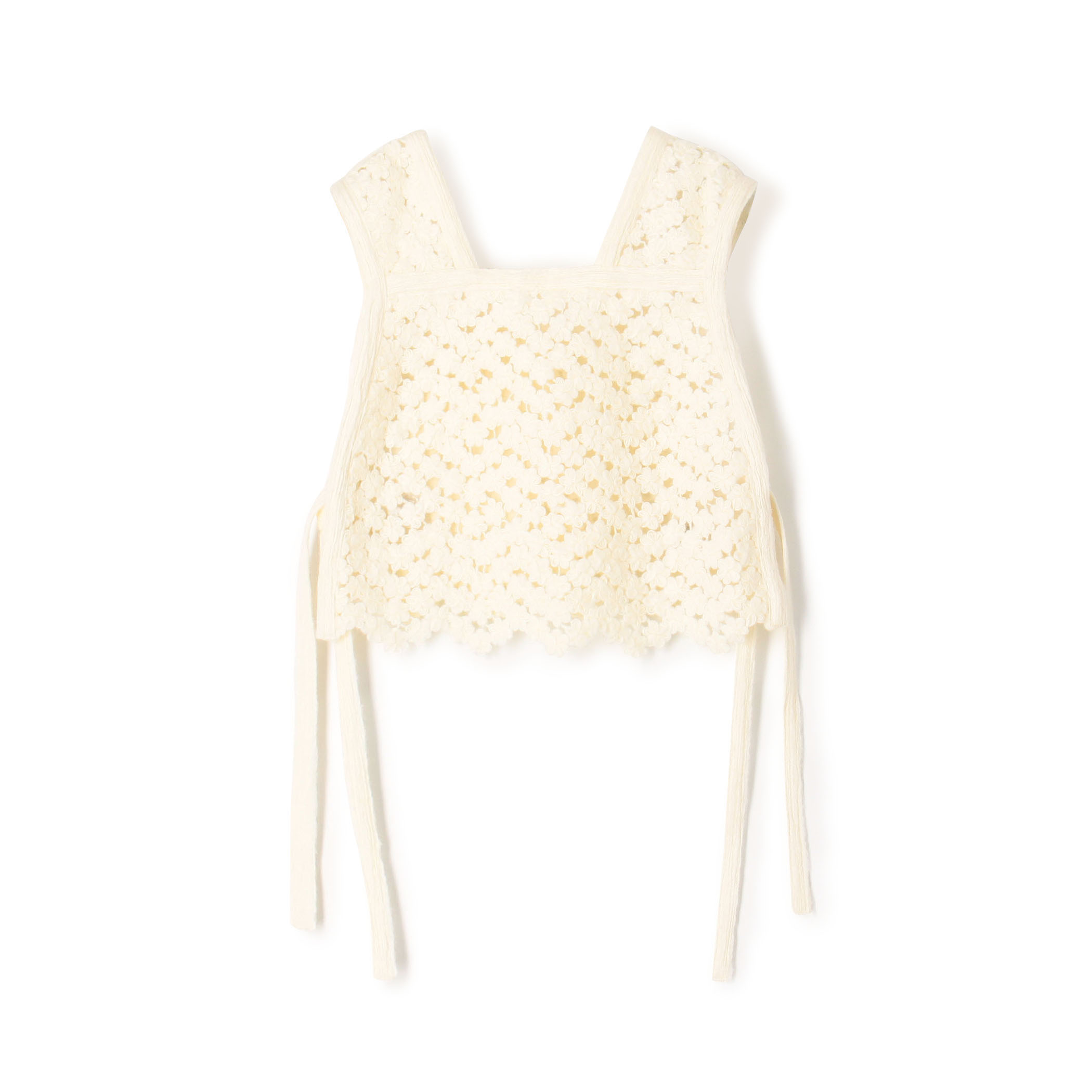 ニットベストは小さなお花が連なったようなデザインで、お持ちのアイテムにプラスワンで使える1着。長めのサイドストリングもポイントになります。