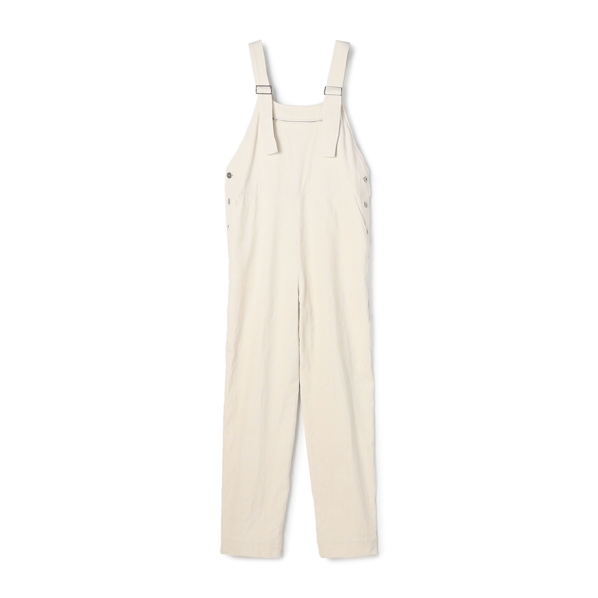 白のオーバーオールにシルクのショップコートを羽織った、大人カジュアルスタイル。