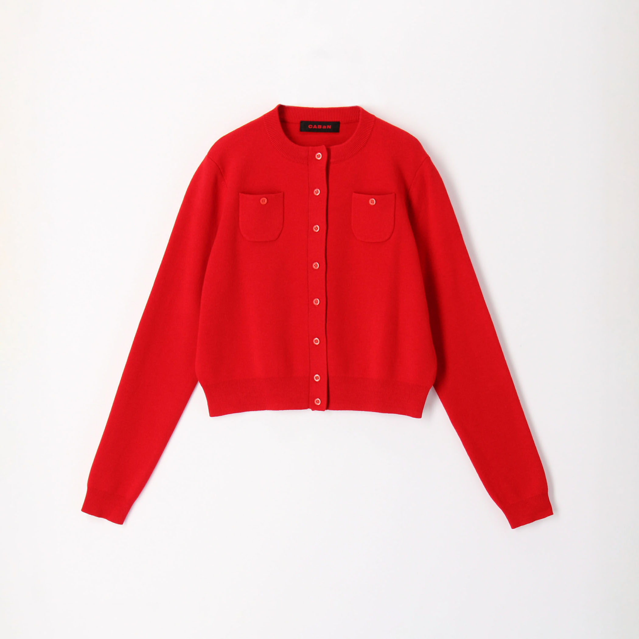 綺麗めな印象の〈BACCA〉のセットアップに〈CABaN〉のコットンカシミアのカーディガンを差し色に合わせました。