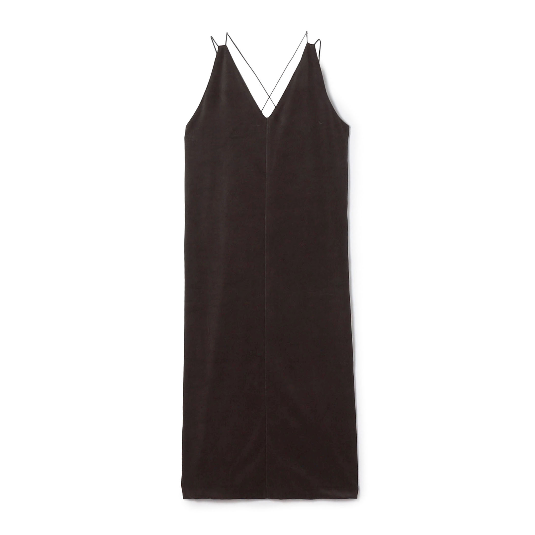 ベロアキャミソールワンピースはバックスタイルの華奢なストラップが大人な印象。