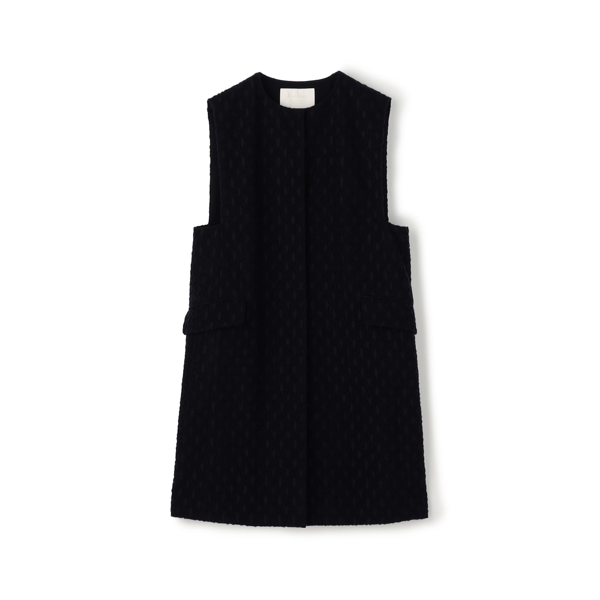 ジャガード織が美しいジレは、ほどよい厚みとすっきりした身幅のデザインになっているためロング丈でも小柄な方にも取り入れていただきやすいかと思います。