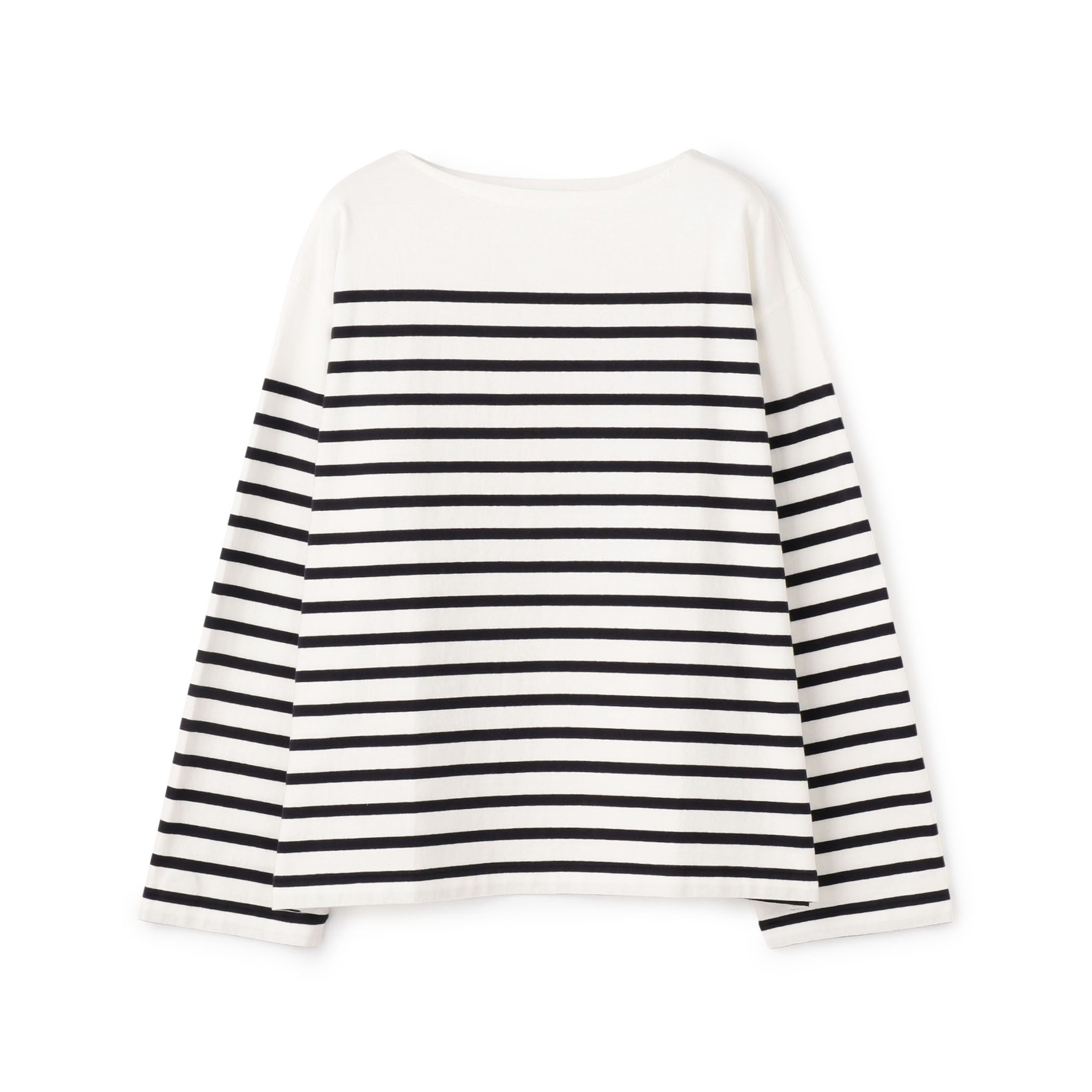 オーバーサイズのボーダーのバスクシャツをモノトーンにコーディネート。