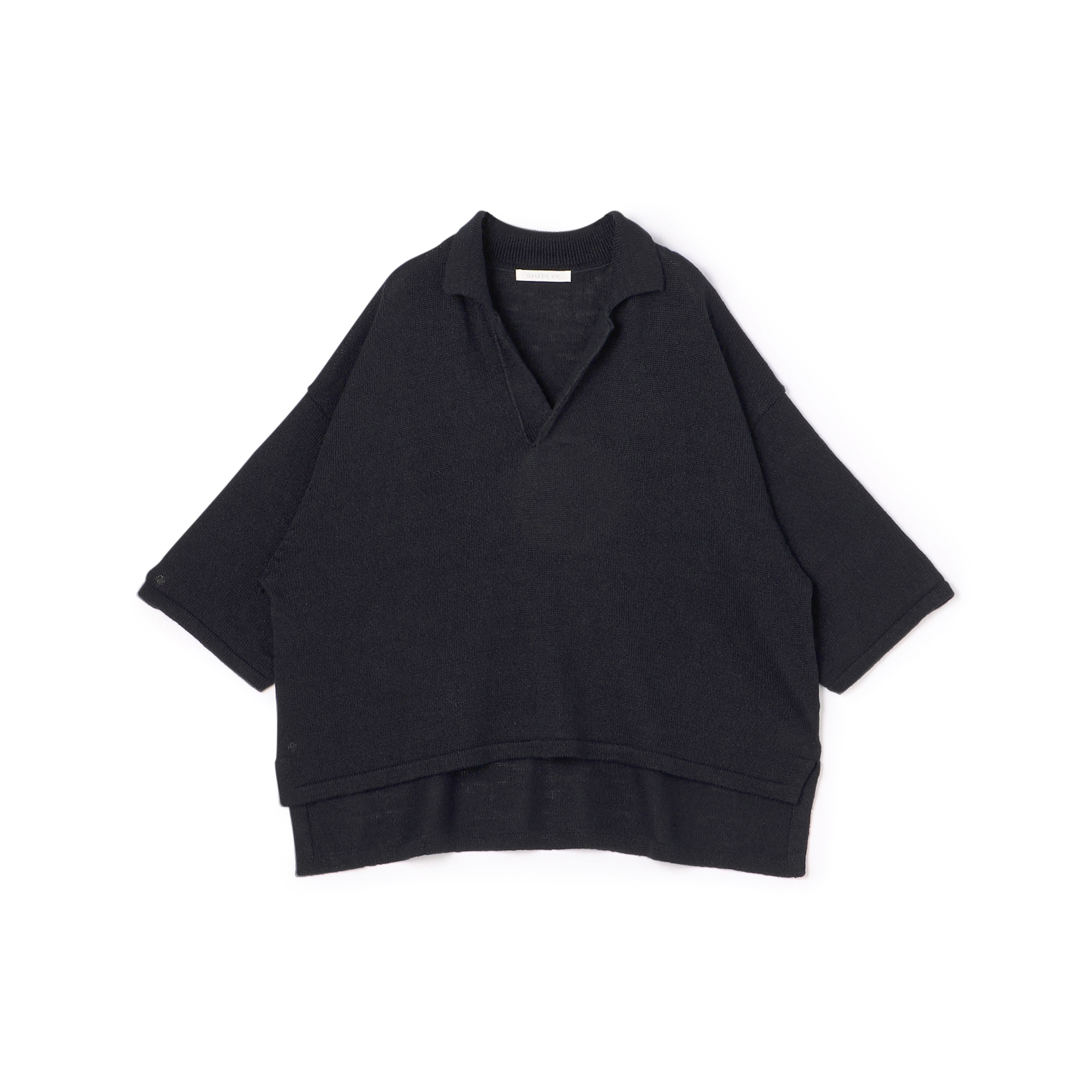 スキッパーの衿元の抜け感が雰囲気のあるリネンニット。