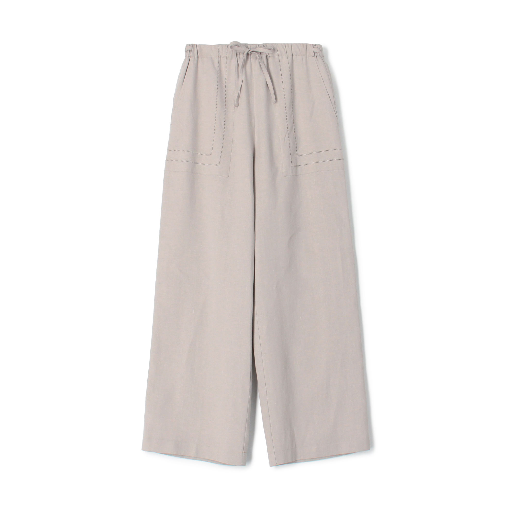 リラックス感のあるTシャツとリネンのワイドパンツのスタイルにテーラーカラーのニットジャケットを羽織り、ほんのりきちんと感を。
