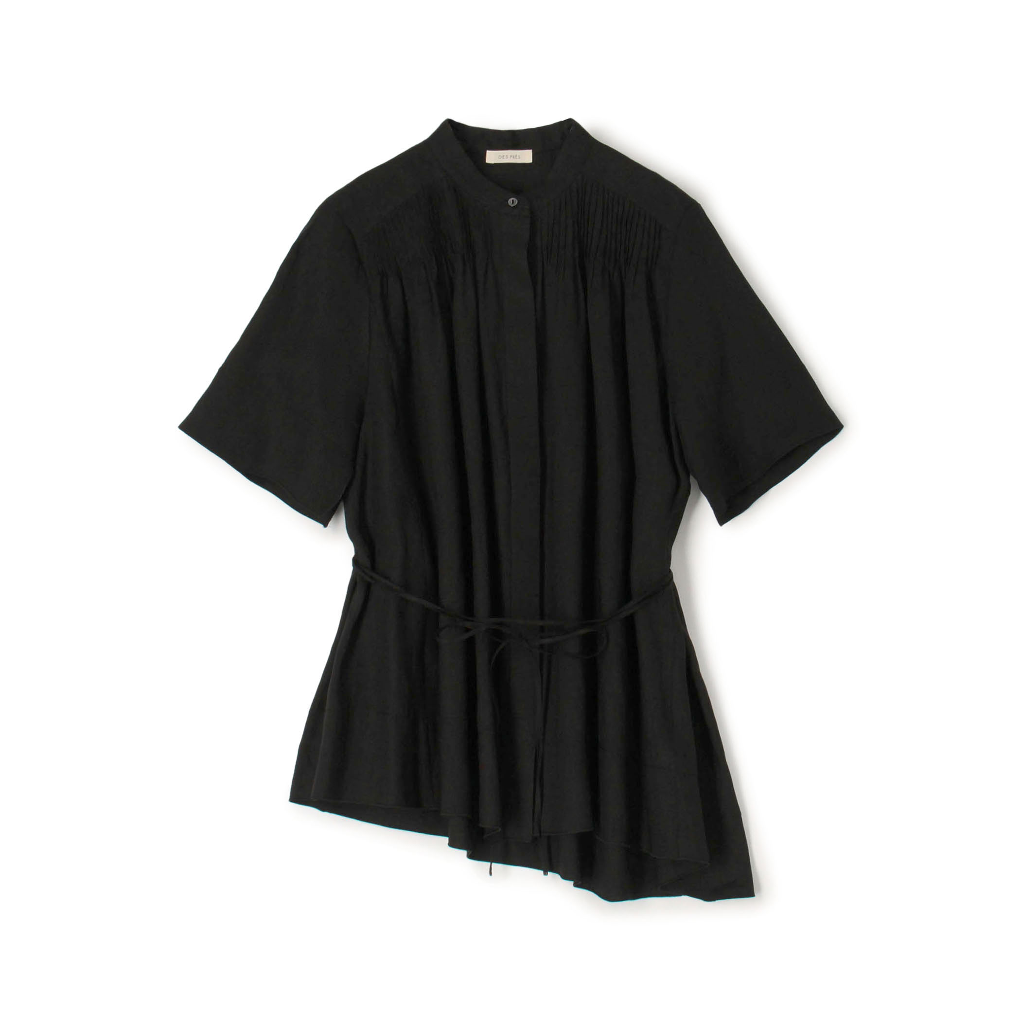 胸元のピンタックやウエストのベルトで、メリハリのついた印象に。