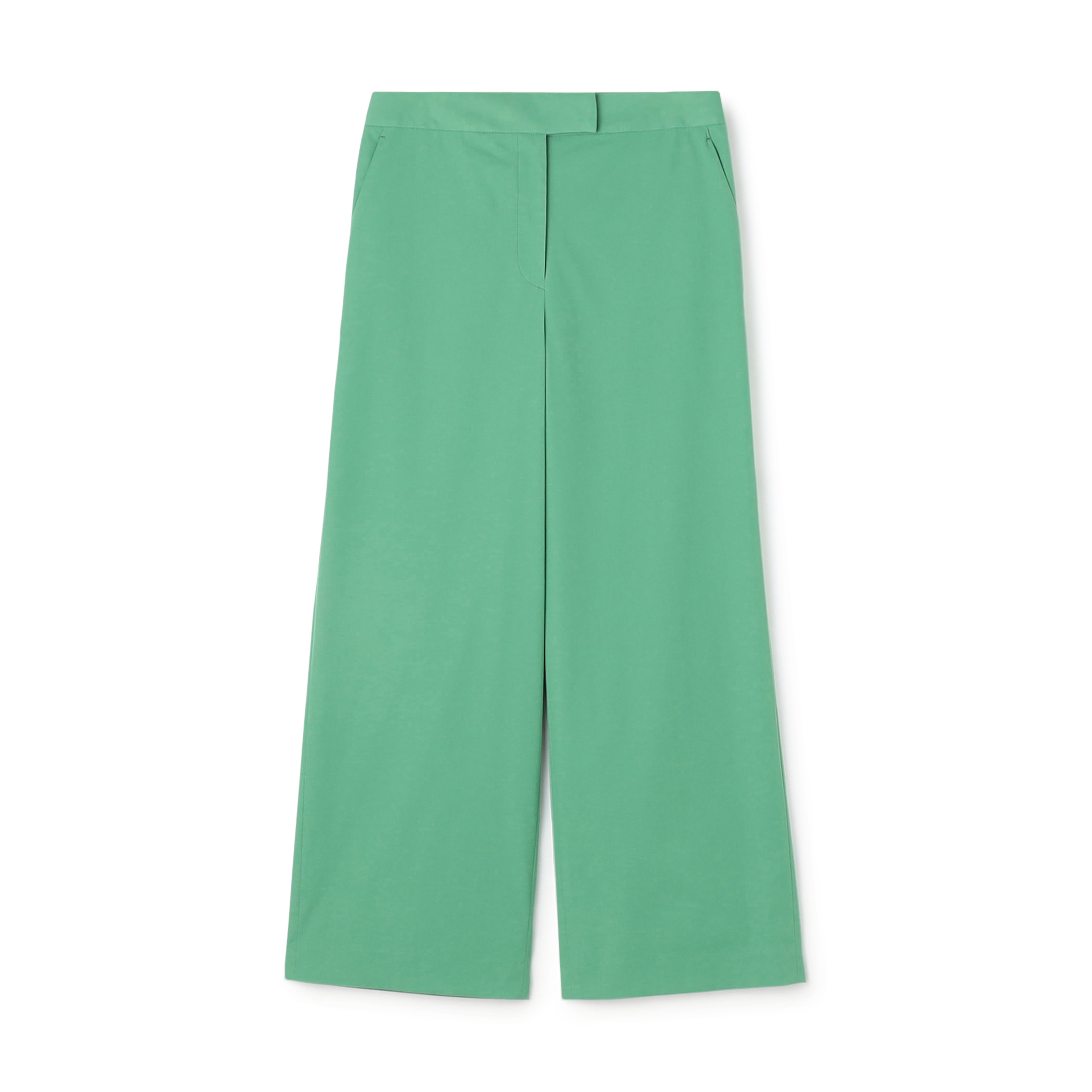 ボトムスには、鮮やかなグリーンのセミワイドパンツをチョイス。