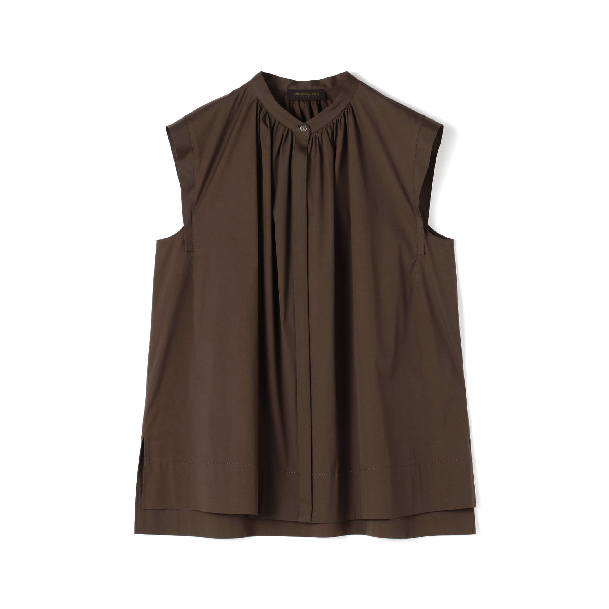 深みのあるブラウンカラーが知的で落ち着いた印象のノースリーブブラウス。