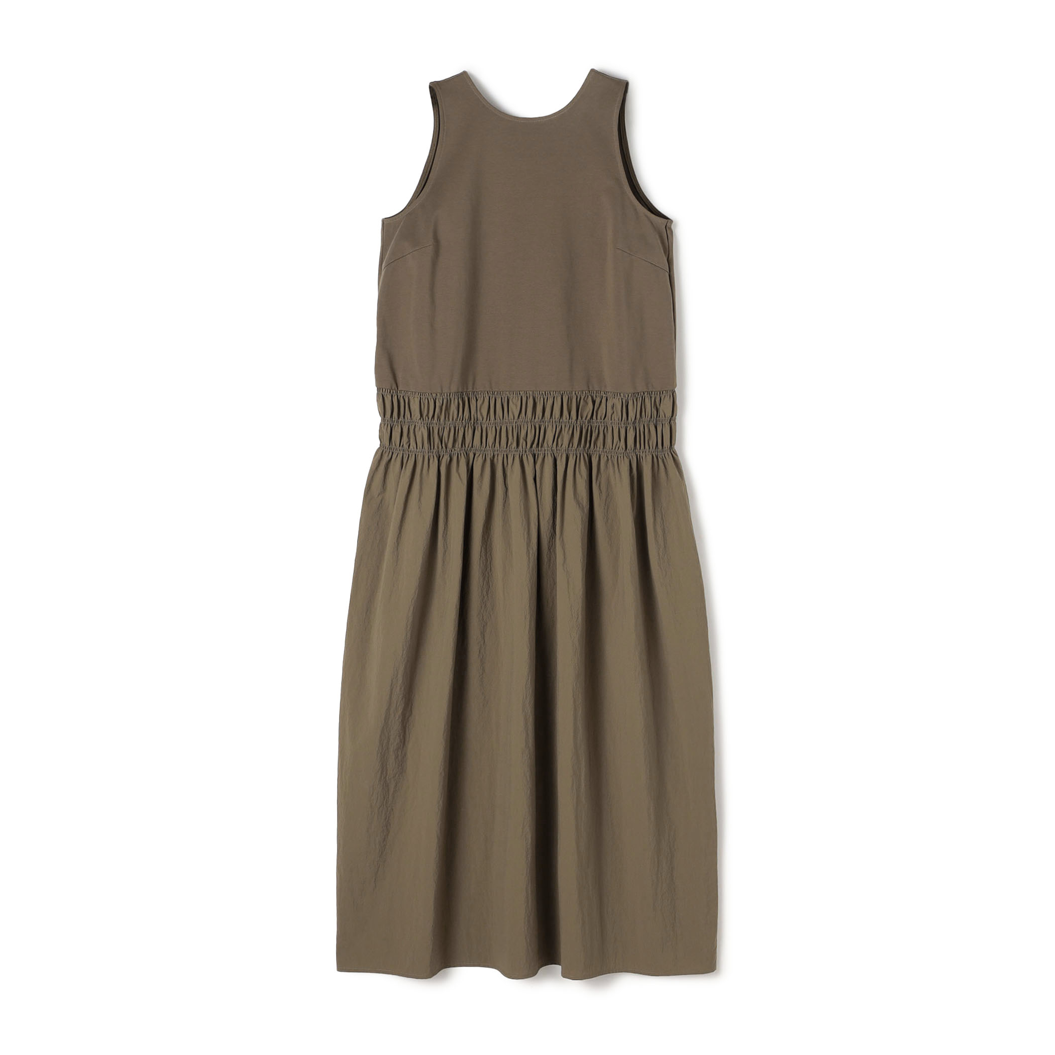 ジャージー素材と、ナイロンの布帛素材をコンビ使いしたワンピース。