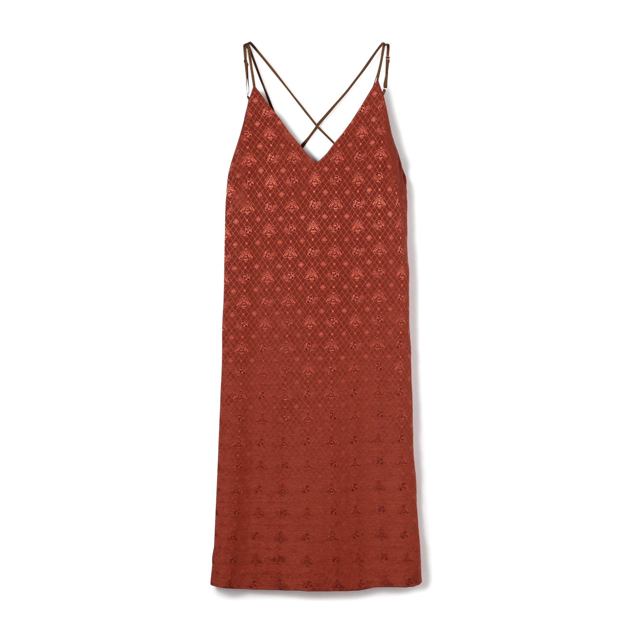 ハチ柄のジャカード素材が目を惹く、遊び心のあるワンピース。肩紐はアジャスター付きで、小柄な方もバランスよくお召しいただけます。