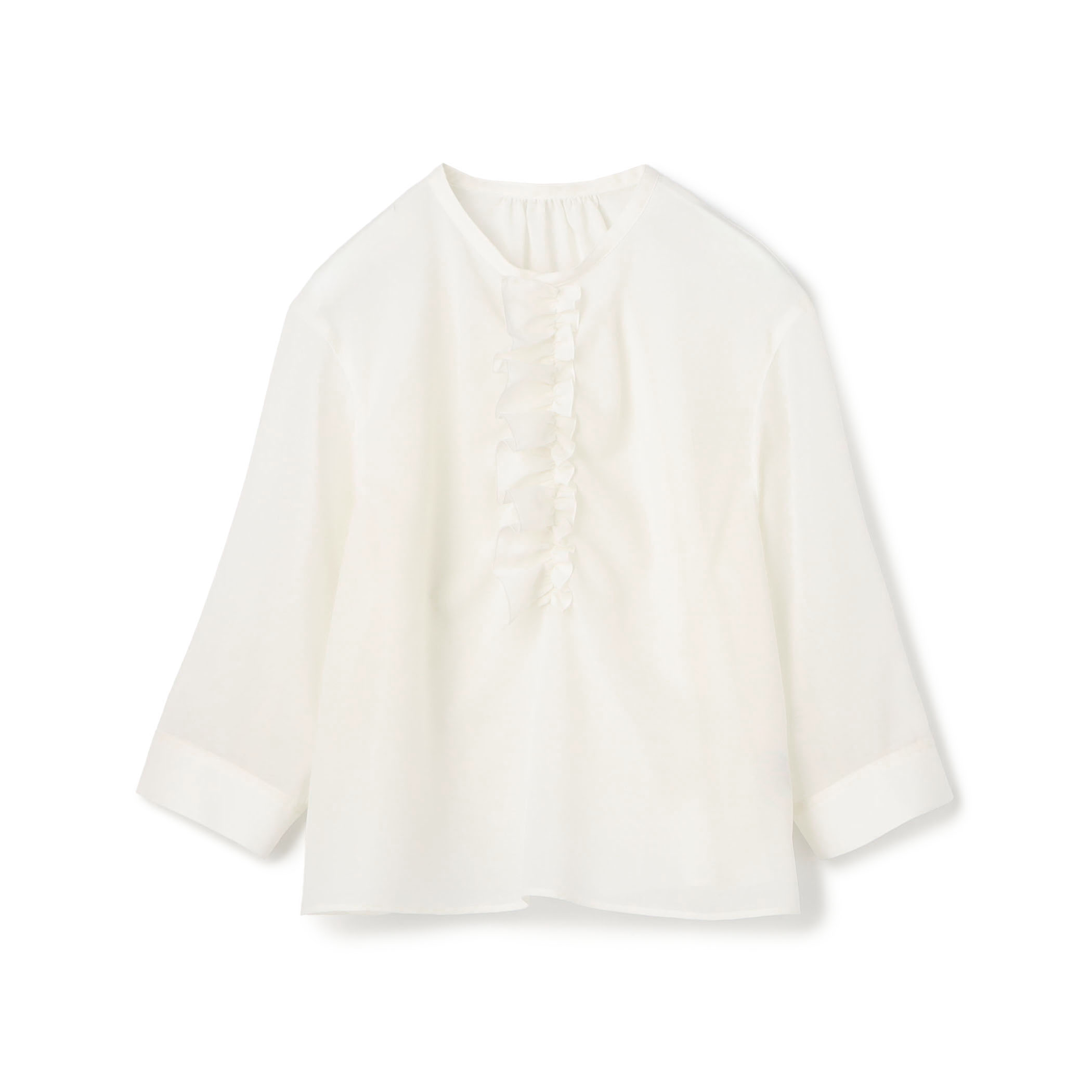 フリルが特徴的な白ブラウスに、秋を感じるボルドーのパンツを合わせています。