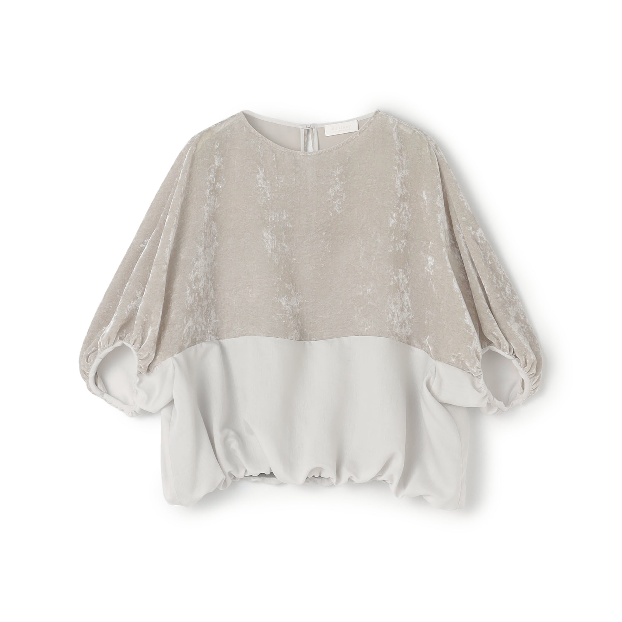 薄手のベルベット素材とポリエステルアセテートの布帛素材をコンビ使いしたブラウスは、丸みのあるふんわりとしたフォルムが特徴で、さらりとした着心地が魅力です。