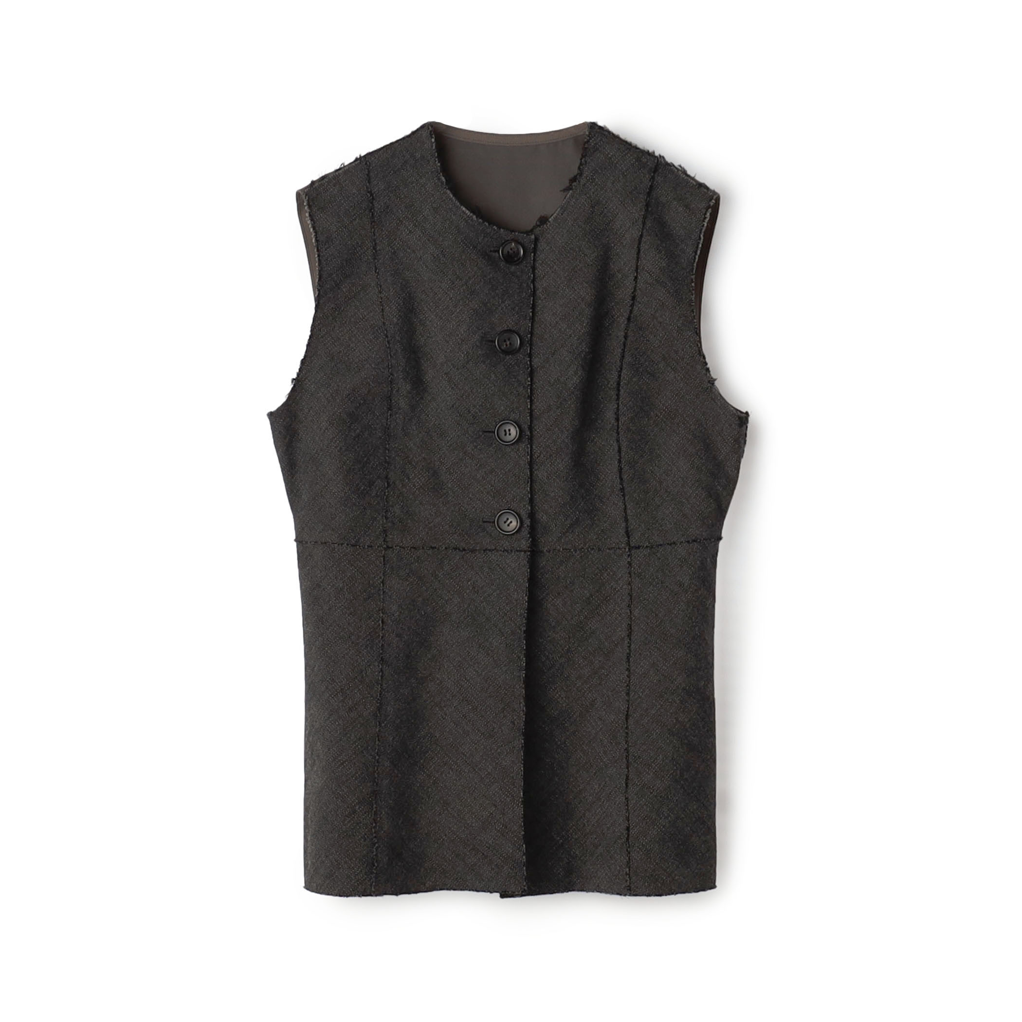 baccaの新作ベストはシックなヘリンボーン柄でトラッドな上品さと切りっぱなしのデザインがモードな印象もあります。