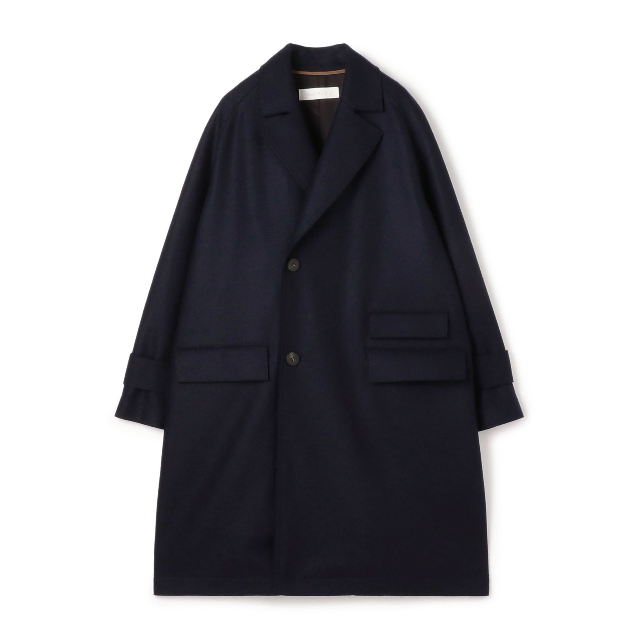 コートはイタリア老舗メーカーの素材を使用したシリーズ。上質な素材感と、見た目以上に軽い着心地が魅力です。長すぎない着丈がさまざまなボトムスと合わせやすく、ポケットのデザインもアクセントになっています。