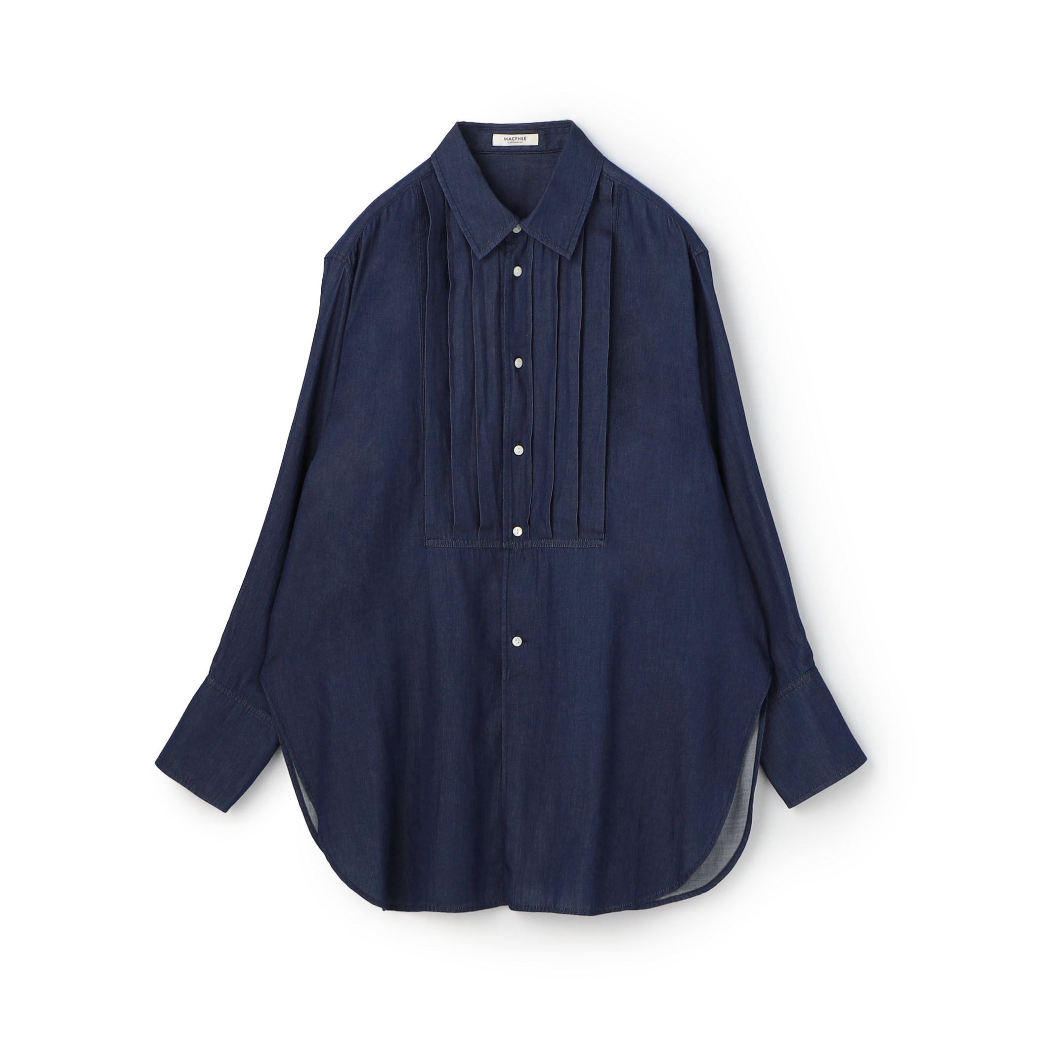 〈MACPHEE〉アルパカヘリンボーン カラーレスジャケットにデニムシャツを合わせたトラッドスタイリング。サテンスカートでエレガントな雰囲気を出して女性らしさを意識しました。