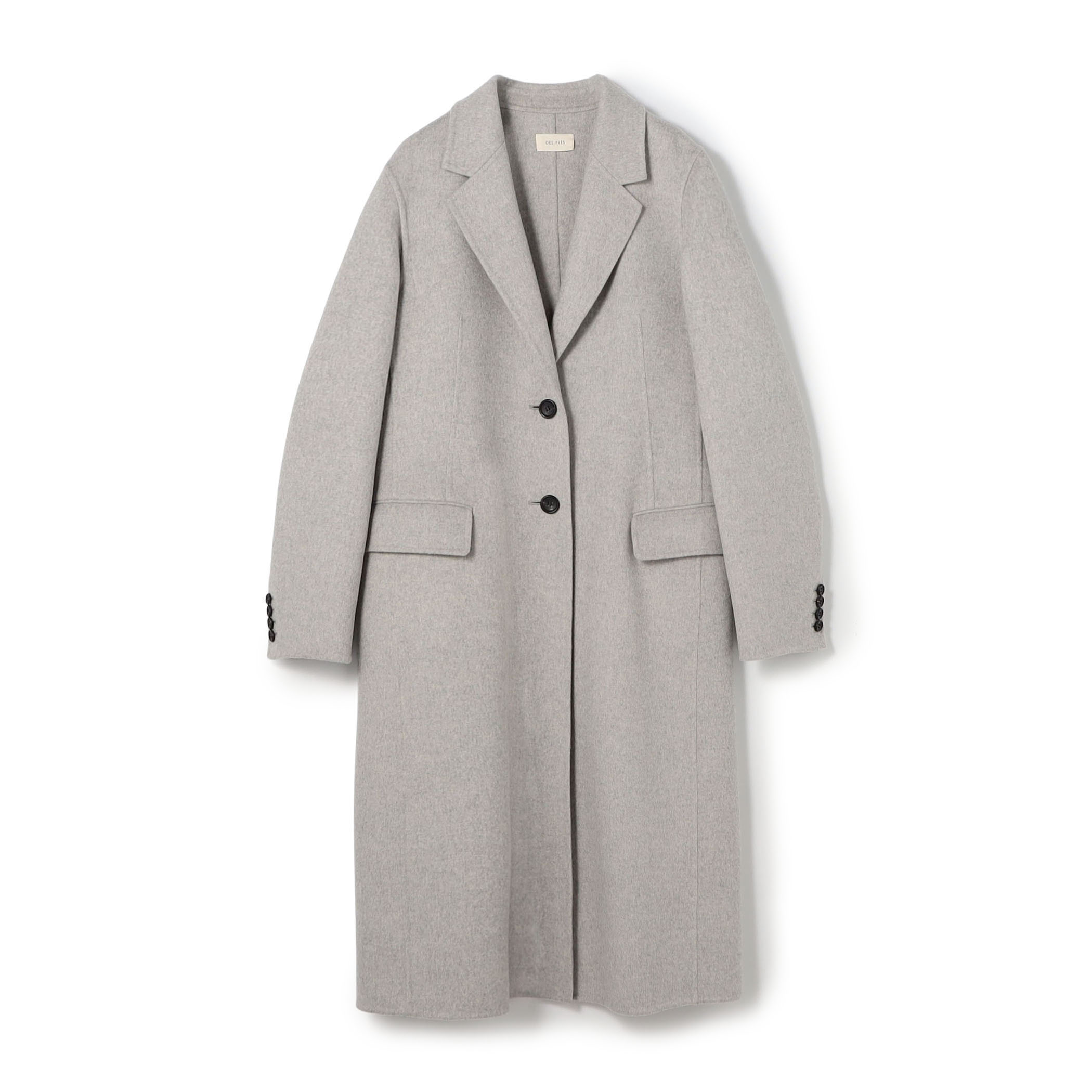 チェスターコートはすっきりとしたストレートシルエットで、マニッシュな雰囲気の一枚。