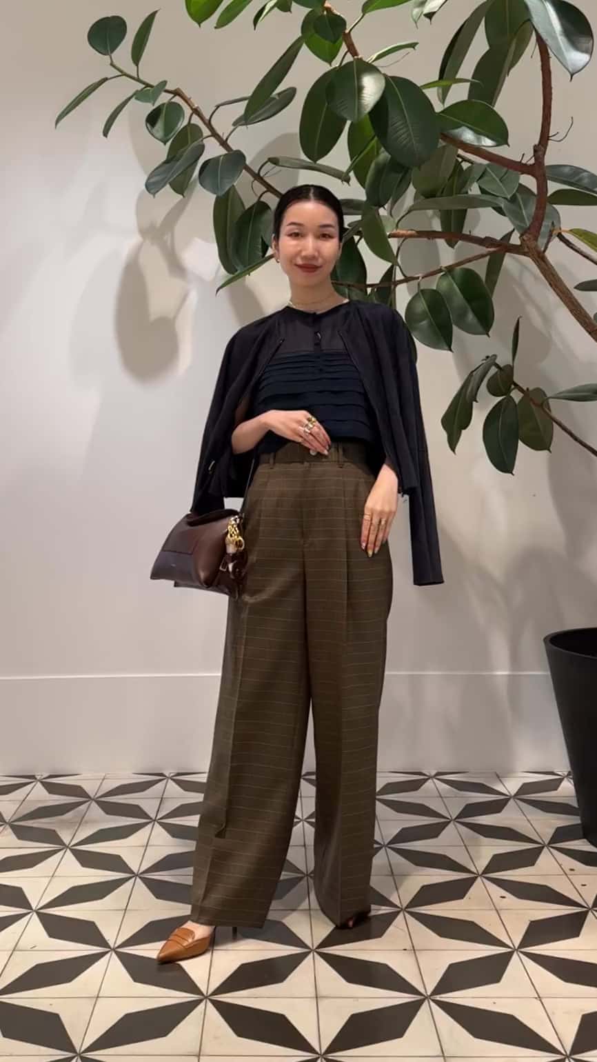 チェック柄のワイドパンツがクラシカルなムードを添えつつ、ゆとりのあるシルエットでリラックス感も演出しています。