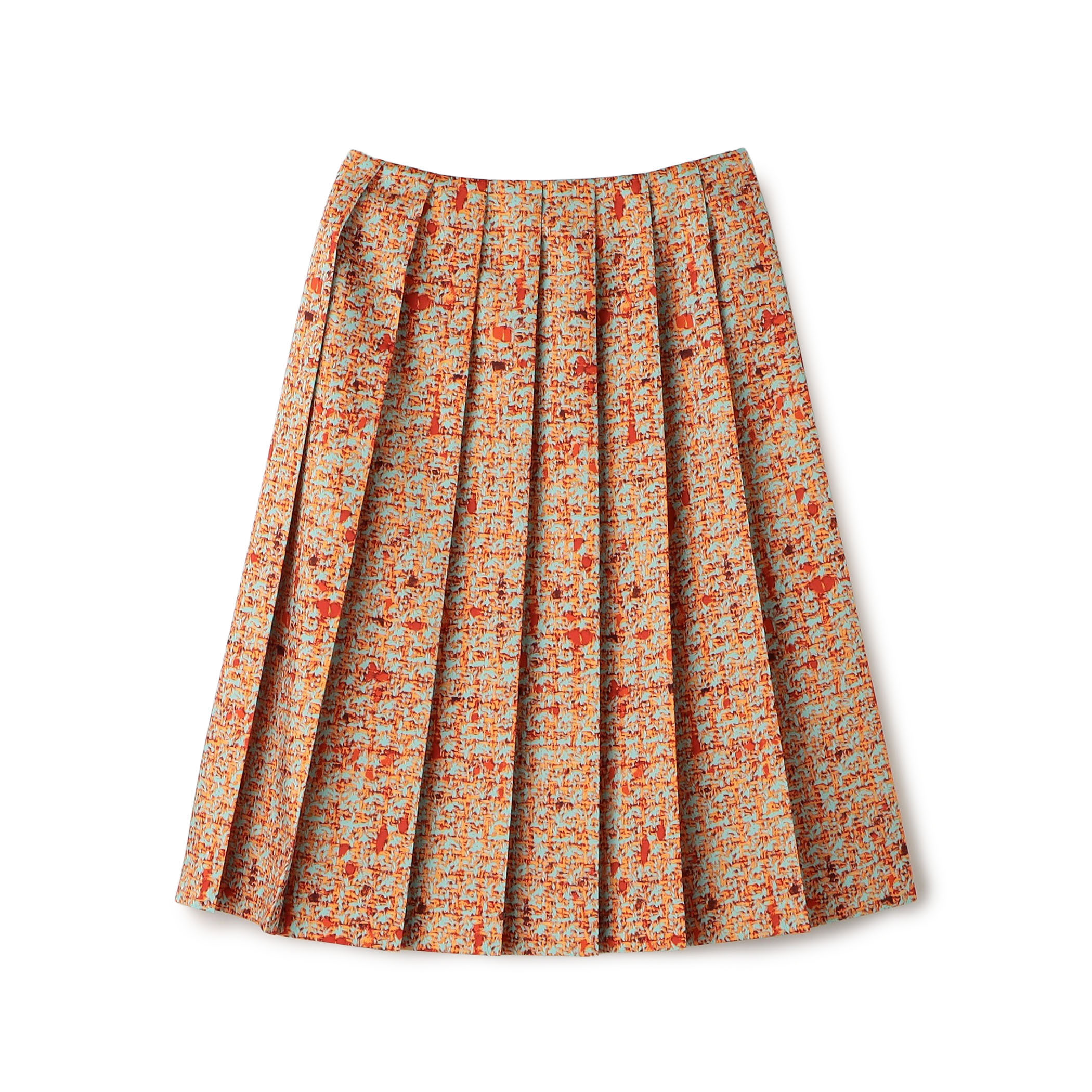 綺麗なV開きなので柄のインナーと合わせて、短めの丈も活かしてミディアム丈のスカートとのスタイリングにしました。
