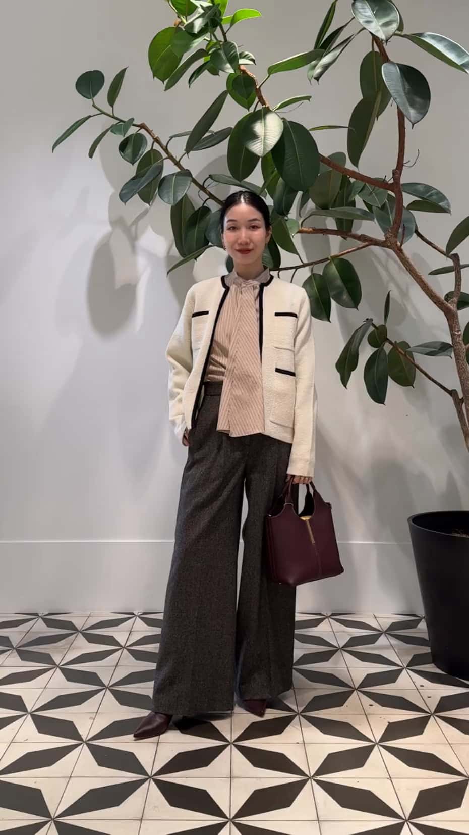 ゆるやかに広がるワイドシルエットと繊細なヘリンボーン柄が、落ち着いた中にも存在感を添えています。