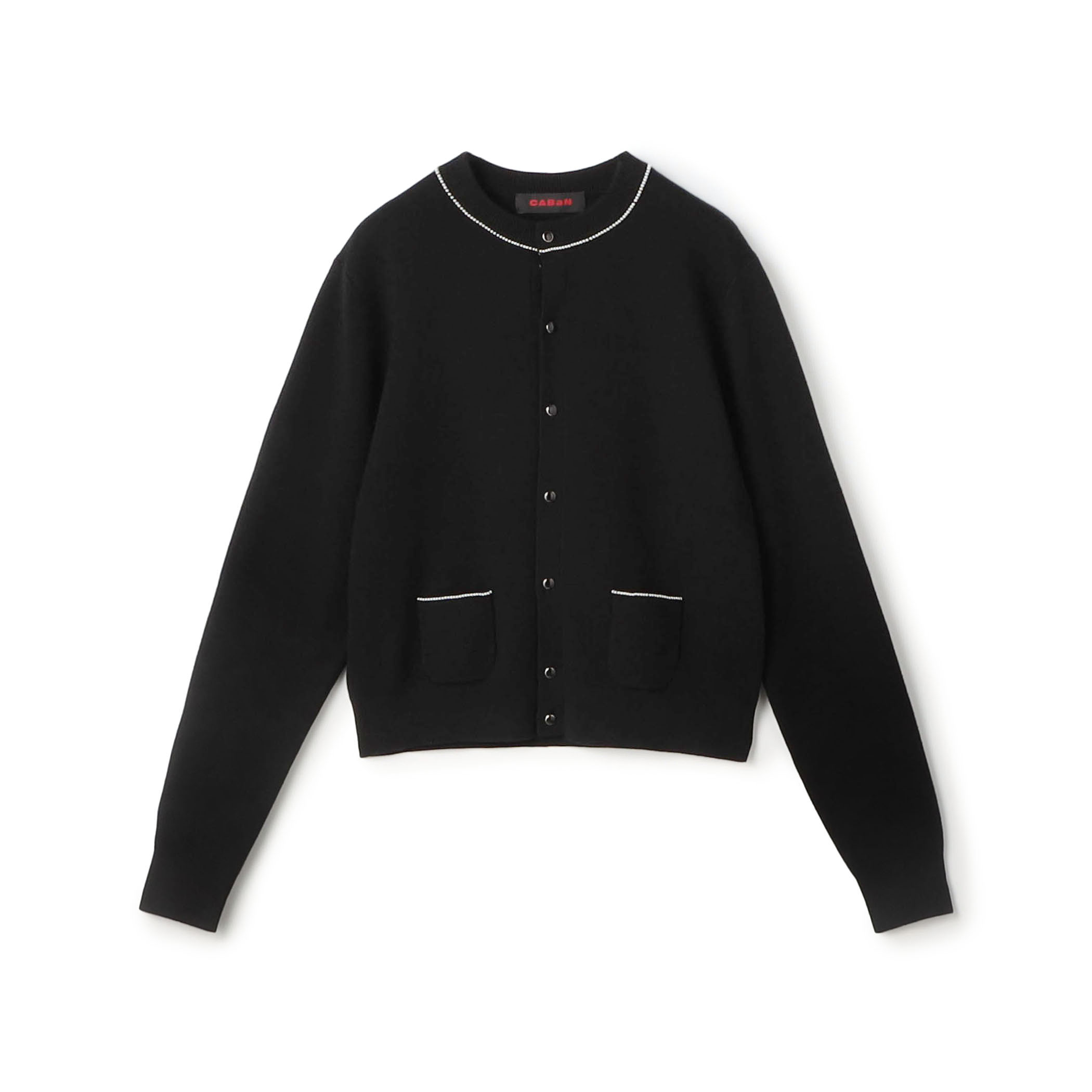 CABaN定番のコットンカシミヤを使用したカーディガンは、首元とポケットにパールが施されており、1枚で上品な印象に。