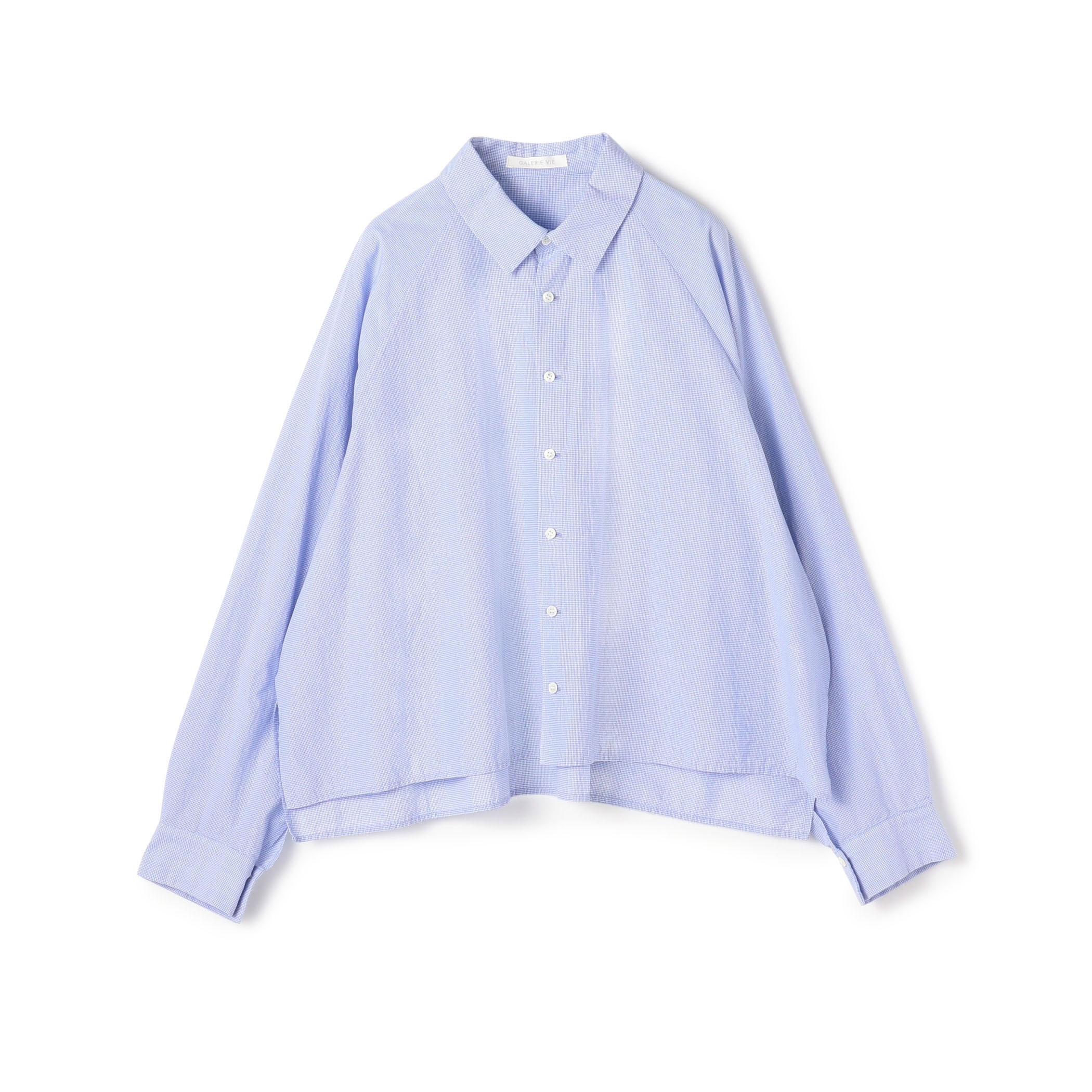 ギンガムチェック柄のコットンシャツとスムースウールブラウスのレイヤードスタイル。