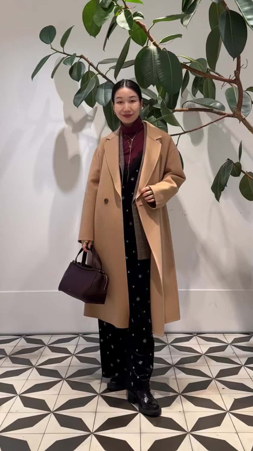 アウターは軽く羽織れるチェスターコートを合わせ、オンオフ問わず取り入れやすいスタイルに。