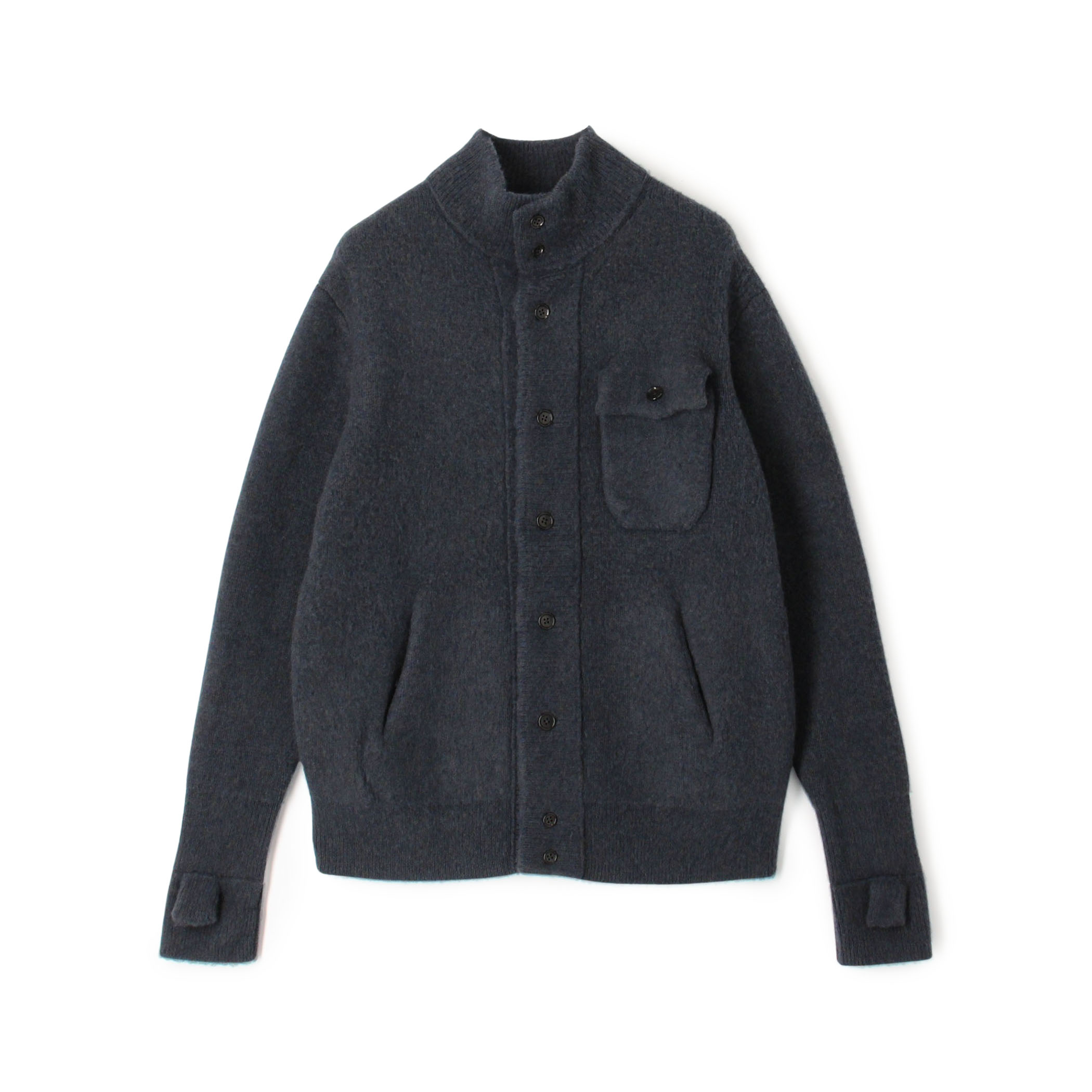 ウール、カシミヤ、シルクの素材を使用したニットアウター。それぞれの素材の良さが詰まったアイテムで軽くて暖かく肌当たりの良い、膨らみのあるシルエットでカーディガン感覚で着用頂けます。また袖口にある親指を入れるサックが特徴的なデザインです。