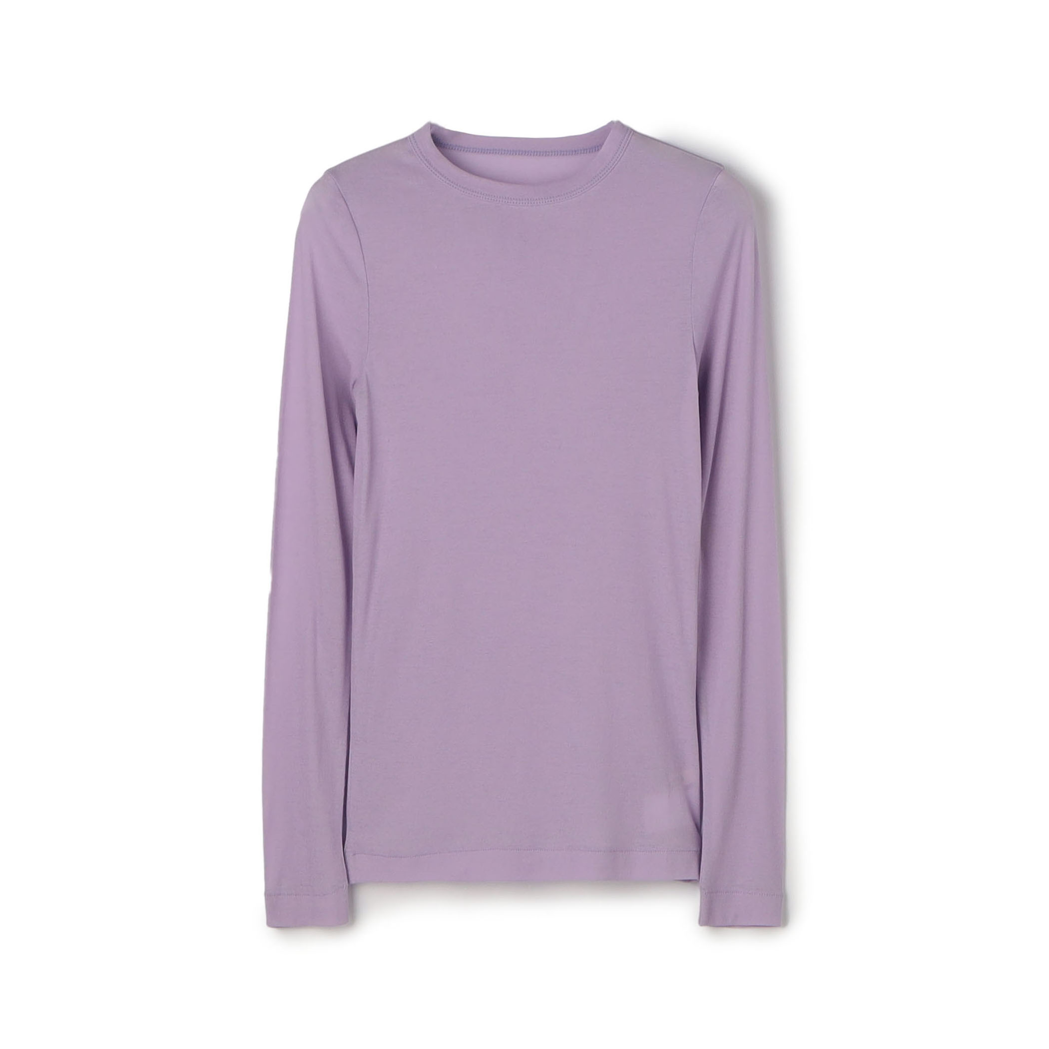 インナーにはライトパープルのコットンTシャツを合わせ、ブラウンやベージュを基調とした配色の中に、ほのかな色味のニュアンスをプラス。