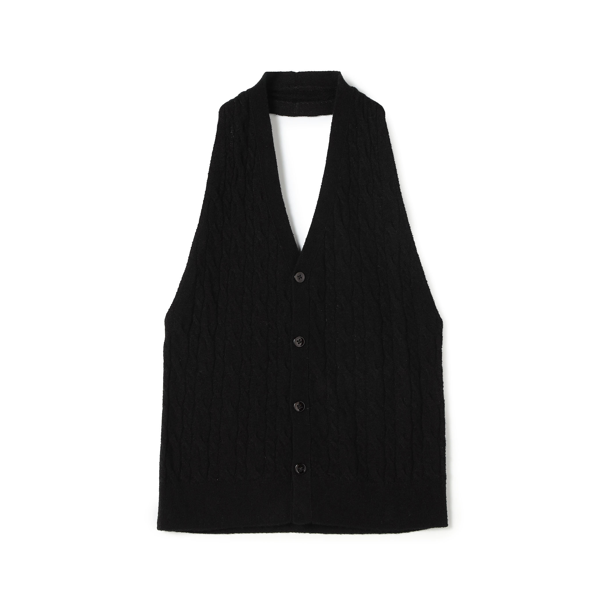 〈TOMORROWLAND.B〉カシミヤシルク ケーブルニットホルターネックベストは、背中が大胆に空いているので、シャツやTシャツと合わせるのも素敵ですが、キャミソールなどと合わせてヘルシーに着るのもおすすめです。