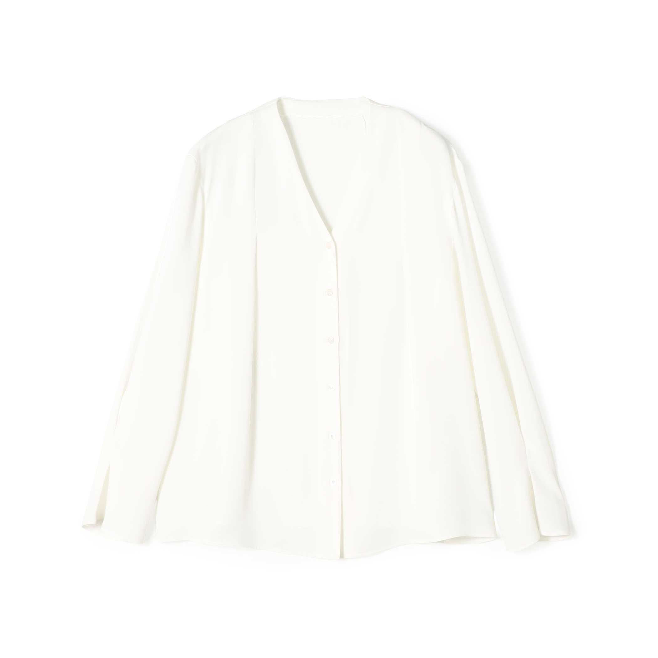 すっきり見えるVネックで女性らしい印象に。