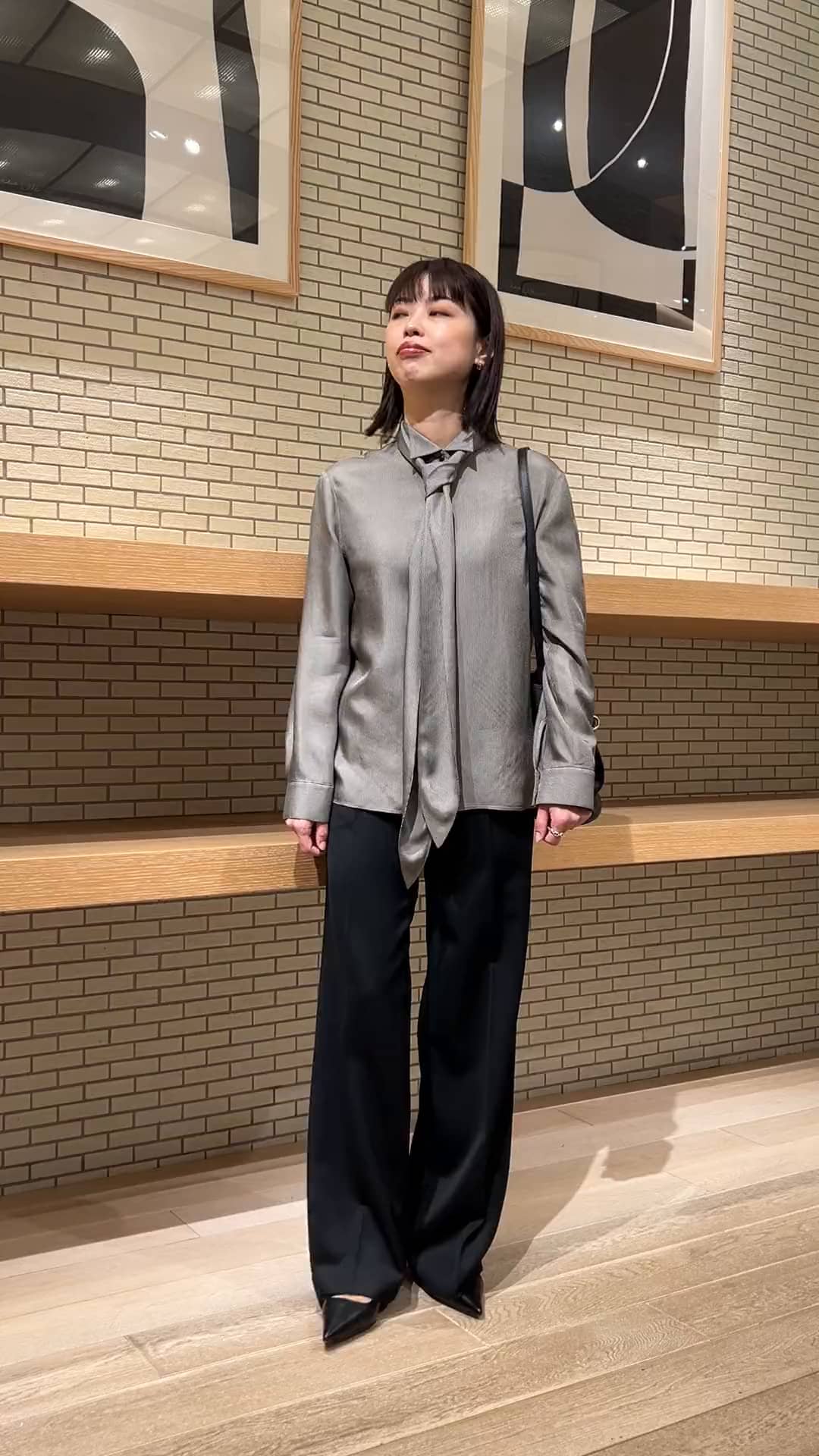 ボリュームのあるボウタイはリボン結びにするだけでなく、取り外して着こなすのもおすすめです。今回はタイにしてドスキンウールのパンツと合わせマニッシュなイメージでコーディネートしてみました。