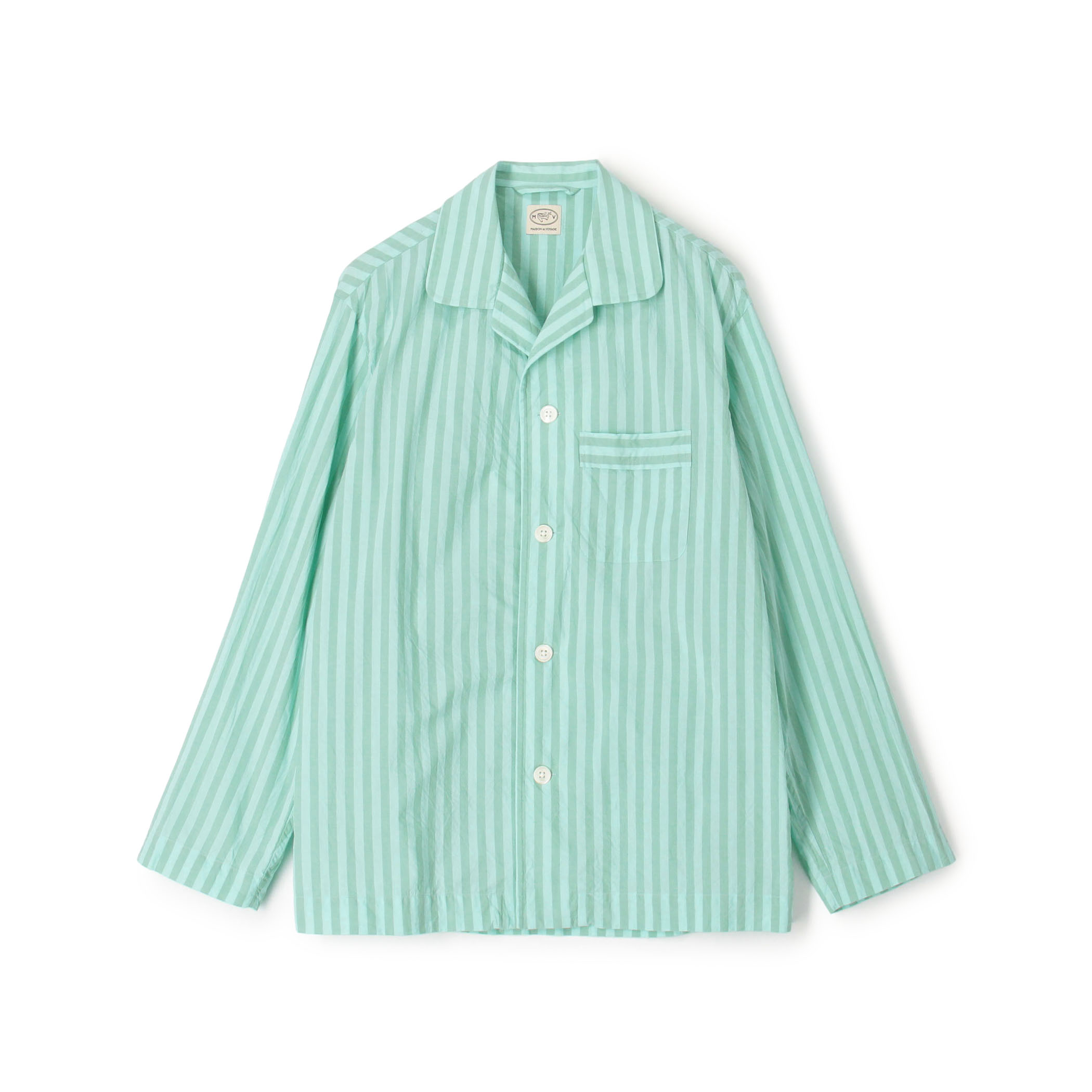 ヴィンテージのパジャマシャツをベースにして企画されたシャツを羽織ったスタイリングです。